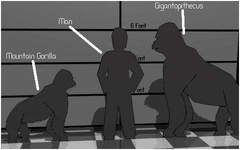 Gigantopithecus was the largest of the primates. (Copyright Lee Krystek 1996) During the Pleistocene Era (1.8 million to 10,000 years ago) large mammals ruled the Earth. One of these mammals was the great ape Gigantopithecus. Gigantopithecus is known to have lived in what is now China and Southeast Asia. (In fact he was discovered, by Professor Gustav von Koenigswald, when the professor bought a set of fossil teeth from a Chinese druggist selling what he claimed were “dragon’s teeth” for medicinal purposes.) Gigantopithecus was the largest primate that ever walked the Earth. He would have risen 9 to 10 feet high if he choose to stand up on only his hind legs, and probably weighed about 600 lbs (A few scientists suggest the largest of the males might have weighted almost 1,200 lbs.). In comparison, the largest gorilla stands only 6 feet tall and weighs about 300 to 400 lbs. Both today’s gorilla and Gigantopithecus probably used their arms and knuckles to move about in quadripedal fashion. Though Gigantopithecus sounds like a terror he probably was a very gentle and retiring vegetarian, if we can use Mountain Gorilla behavior as a guide. Gorilla’s, despite inaccurate stories about them, are fairly shy creatures that only put on aggressive displays of chest-beating and snarling when their territory is threatened. Gigantopithecus actually arose before the start of the Pleistocene Era (perhaps 13 million years ago) and went extinct about halfway through (500,000 years ago) the ice age before the other giant mammals did. Exactly why he went extinct is unknown, but it probably was due to changes in the climate to which Gigantopithecus was not able to adapt. Some suggest that Gigantopithecus is not extinct, but is hiding in remote areas of the Himalaya Mountains or the forests of North-West America. Could a Gigantopithecus, or his descendants, be the source of the Yeti or Bigfoot tales?Good questionUnMuseum… I definitely think it could.