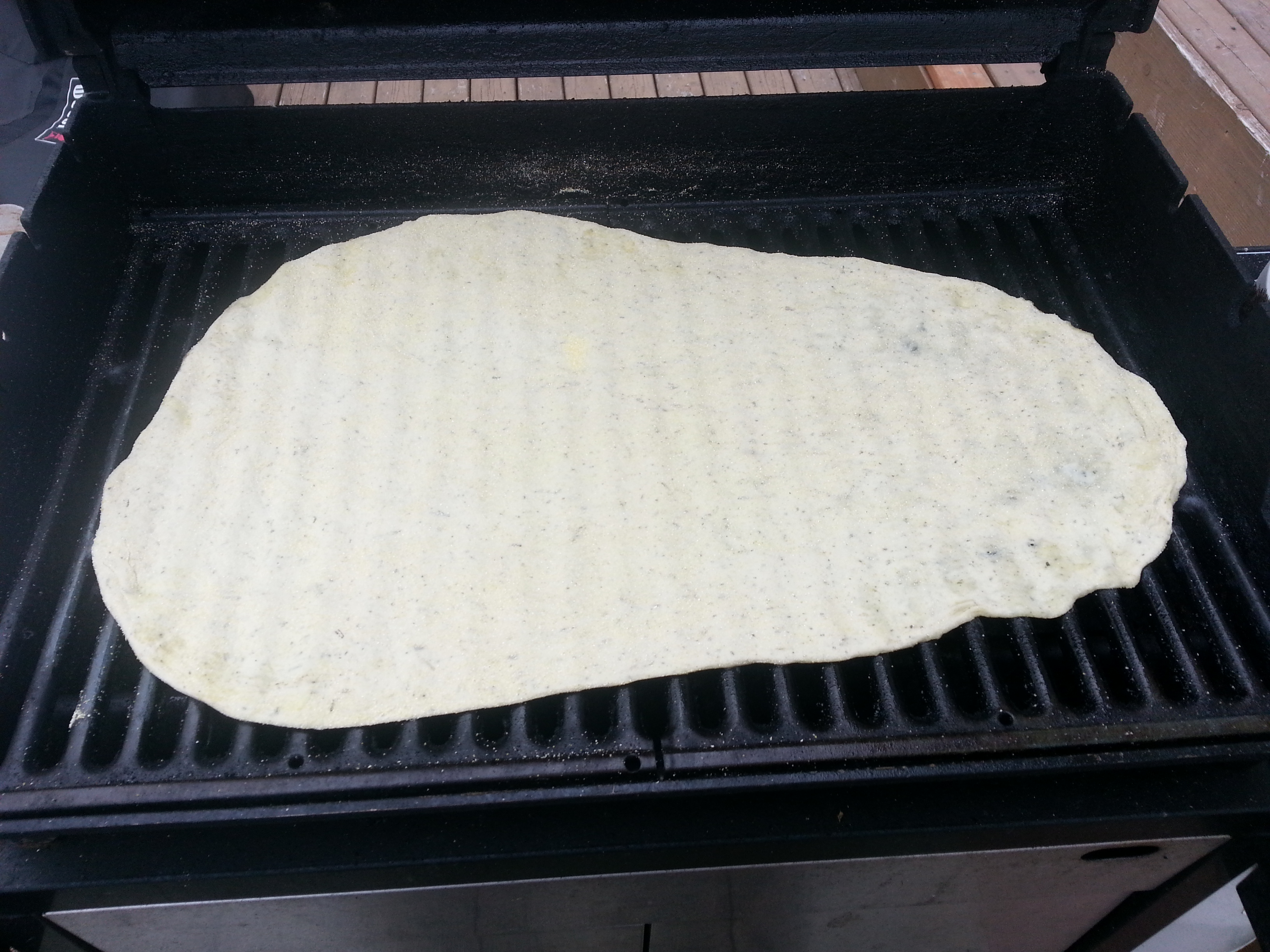 Once your dough is good to go, roll it out to your desired thickness. To roll the dough out, lay down a bed of CORNMEAL, coat the dough in it, and use a rolling pin, or beat it down with your hand (or if you’re so skilled, go ahead and toss it). DO NOT USE FLOUR TO ROLL OUT THE DOUGH!!! Using flour for grilled pizza can be problematic. The flour can make the dough mealy (ironic, considering the use of cornmeal), and has the potential to clump with the