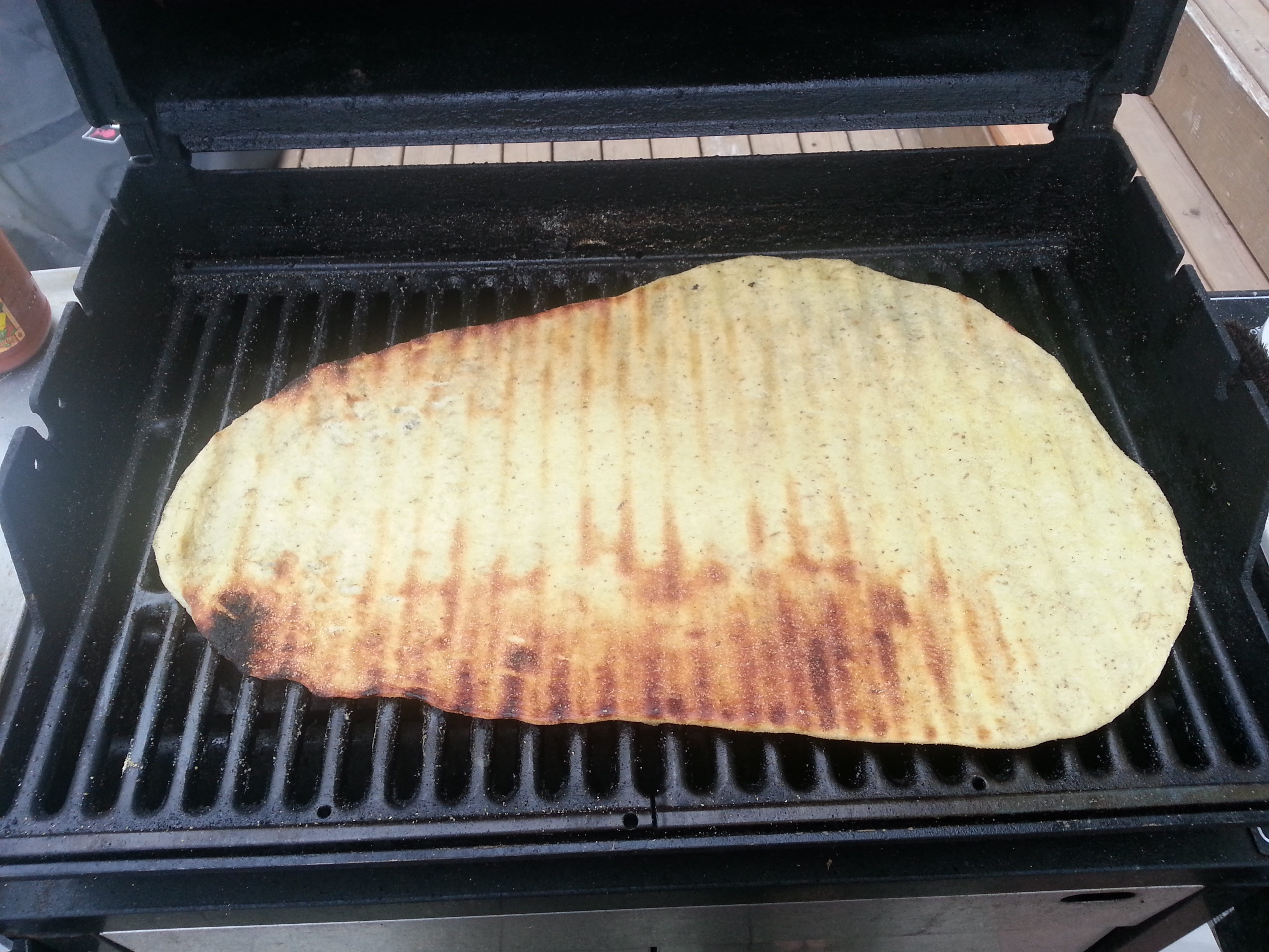 Make sure the grill is turned to medium-low, anything else will burn the crust before it gets crispy, and spray the grates with the non-stick grill spay.
