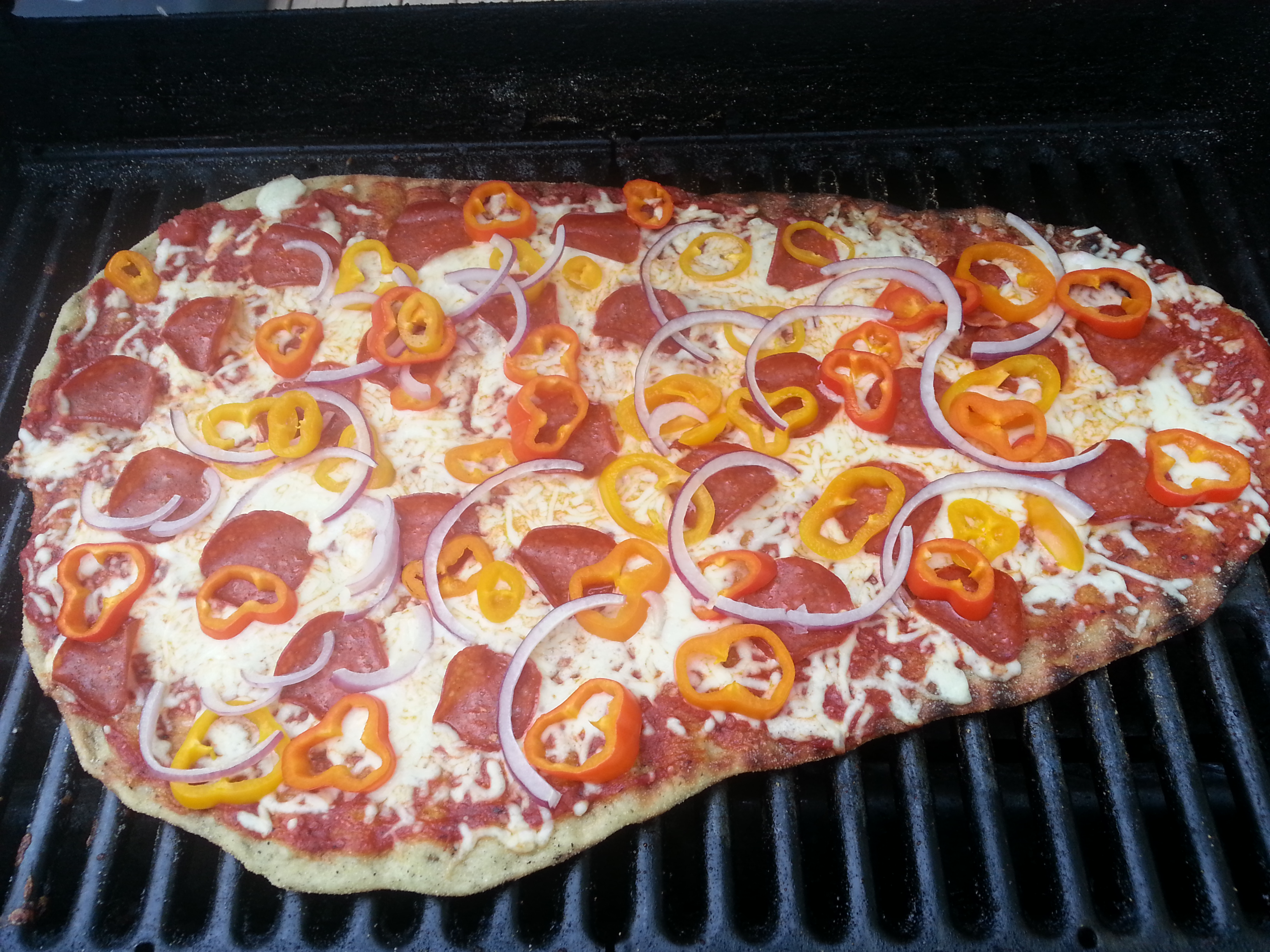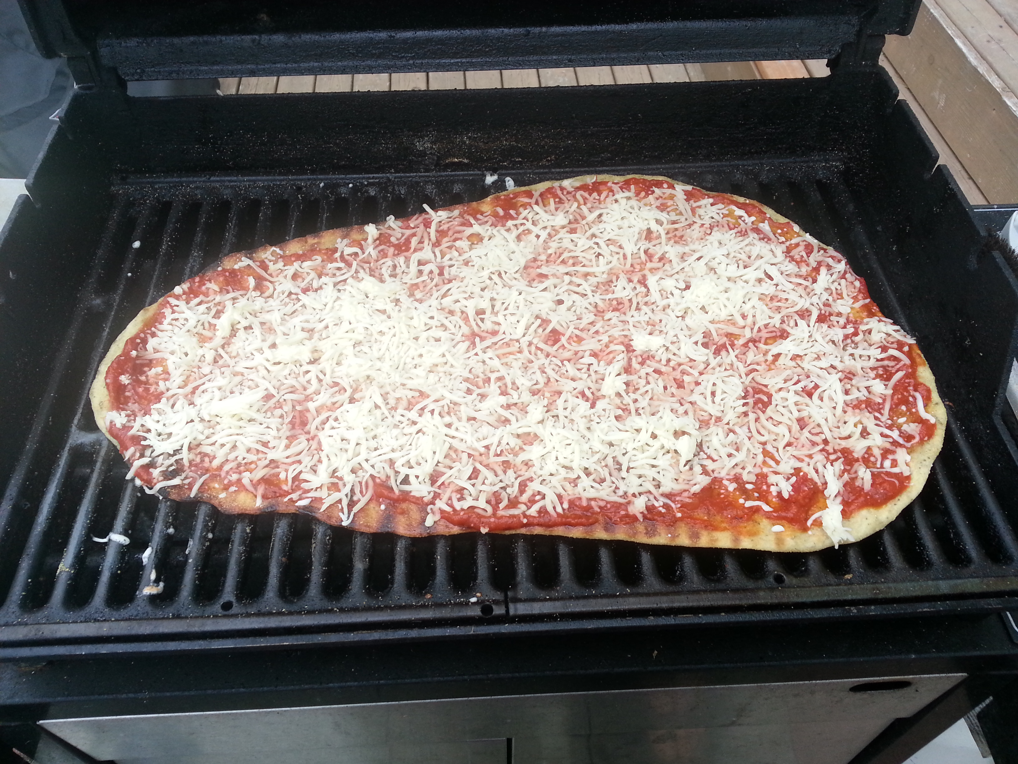 2013-05-30 19.24.20You might want to turn the heat down at this point, so that your closed grill will hover right around 200 degrees. This seems low, but it will allow your toppings and cheese to cook together for longer without burning the crust.
