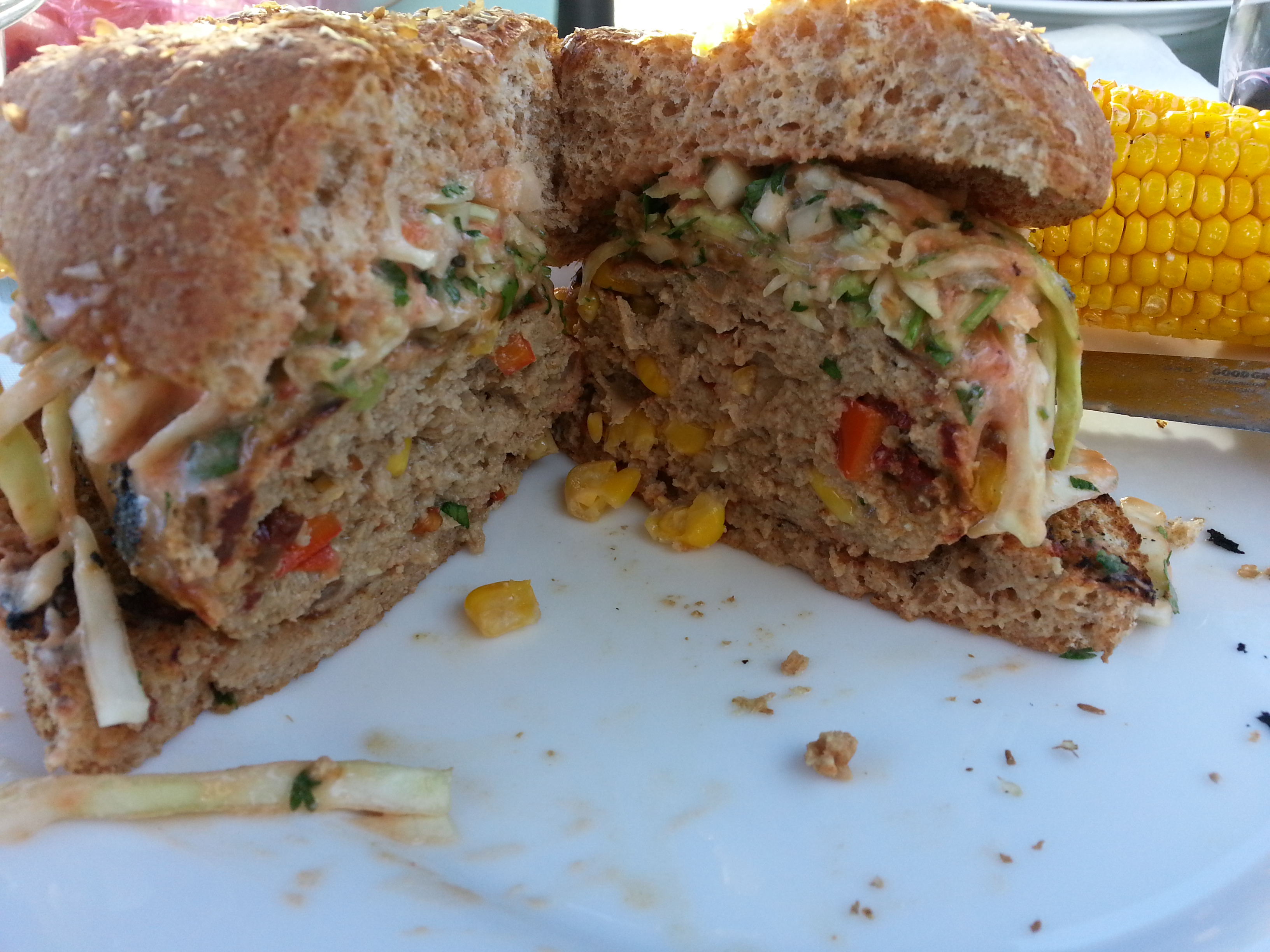 Toast the buns for a minute or two, and remove from heat. Serve the patties with a generous topping of salsa slaw, and enjoy!