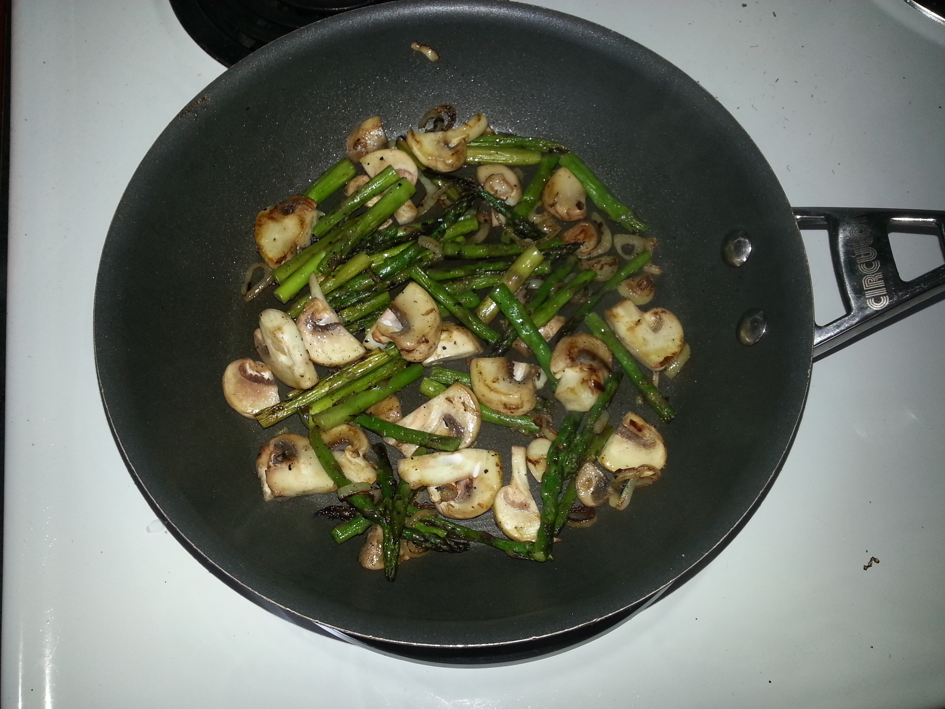 So this one was pretty simple. I browned up the diced shallots with a tab of butter (3 min over medium heat), and then added the mushrooms and the asparagus, which I had cut into bite-sized pieces.