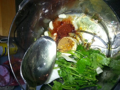 Toss all of those ingredients (not the chicken, obviously) into a food processor, and hit the on button. Let everything process down into a semi-fine marinade. Season to taste. Cover the chicken breasts (I used three large chicken breasts) in the processed mixture, cover with plastic wrap, and let them soak for about an hour. This gives all those great flavors an opportunity to soak into the meat.