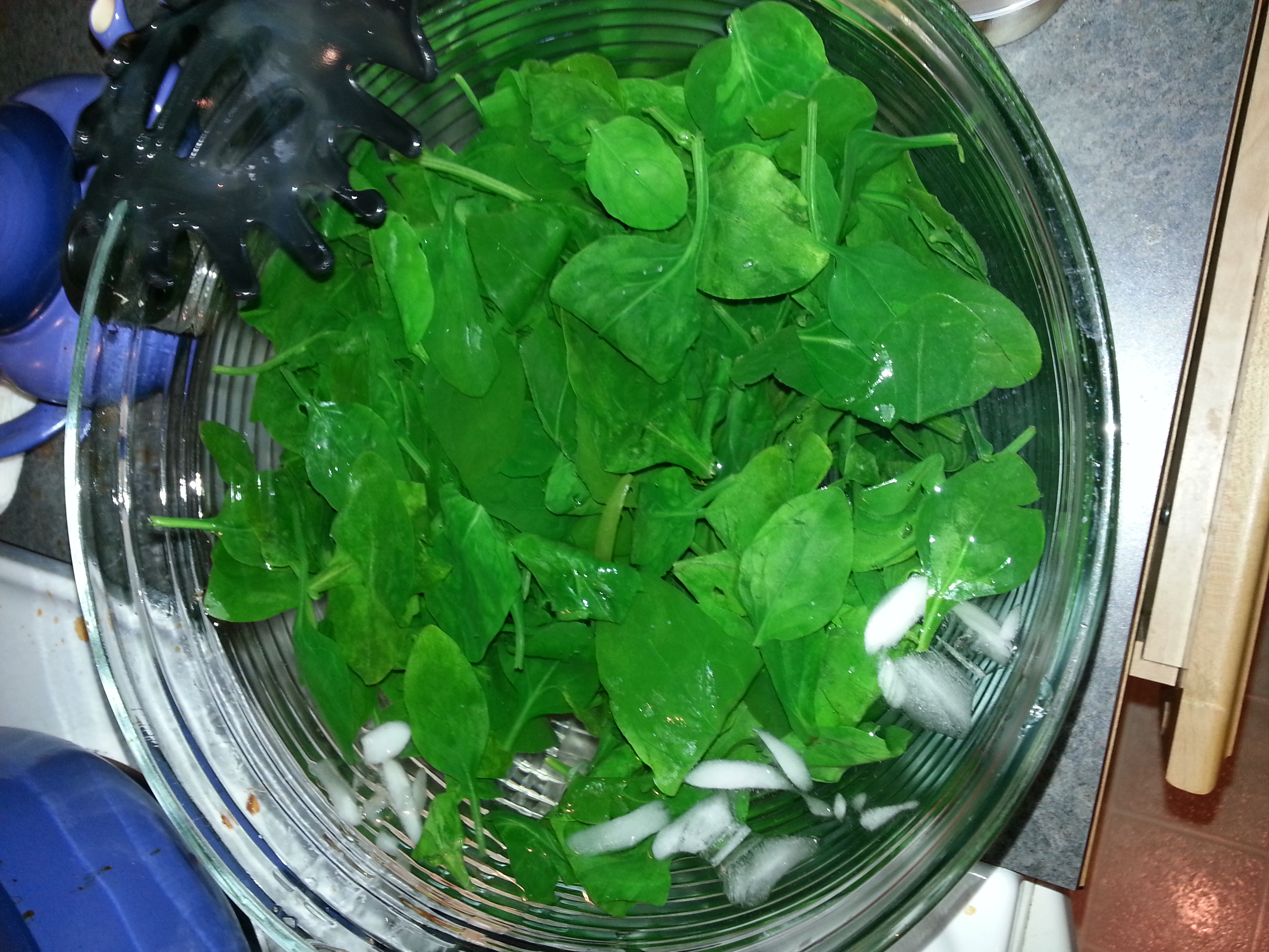 Place the condensed handful of spinach into a food-processor, and process with a pinch of salt and a splash (2-3 tablespoons) of water until the texture is very fine.