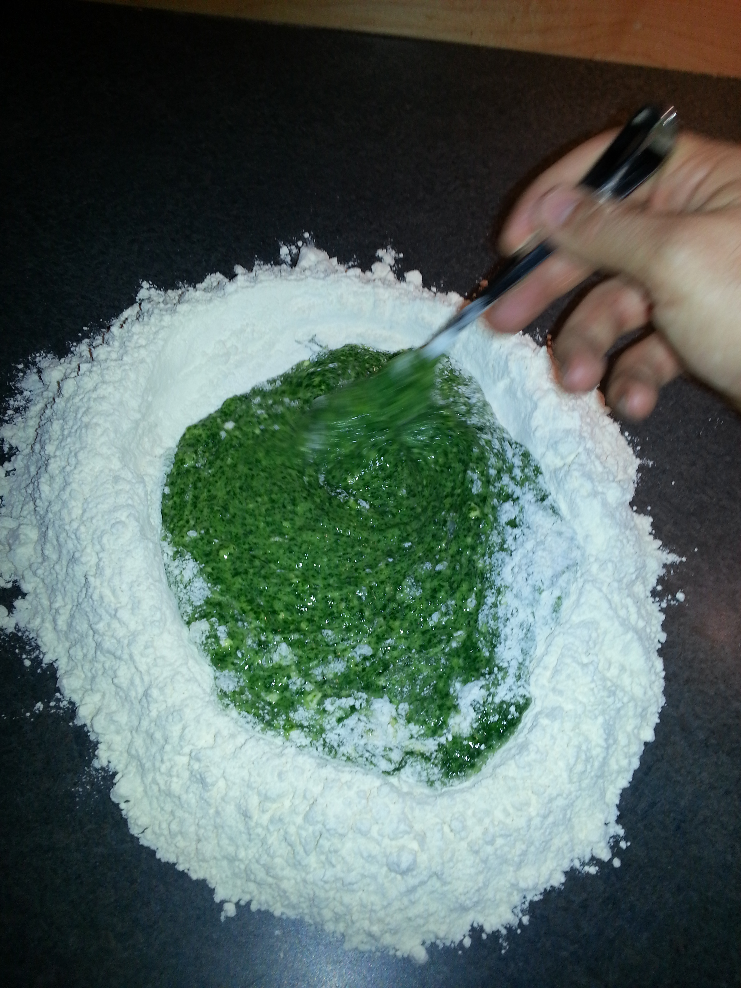 Add 2 tablespoons of water and the spinach to the mixture and continue beating. Slowly fold in the flour until you can forgo the fork and use your hands.
