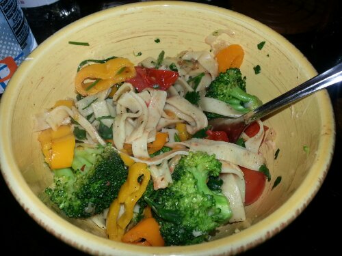 I thought there was nothing in the fridge for dinner, but then I remembered that I had some leftover lemon pepper linguine from dinner Friday (handmade, of course). I fried up some garlic in a tablespoon of Olio Dorato, added sweet peppers, broccoli, cherry tomatoes and a pinch of red pepper, stirred in the linguine, added a dash of water, and then topped the whole thing off with fresh parsley and parmesan! Delicious!