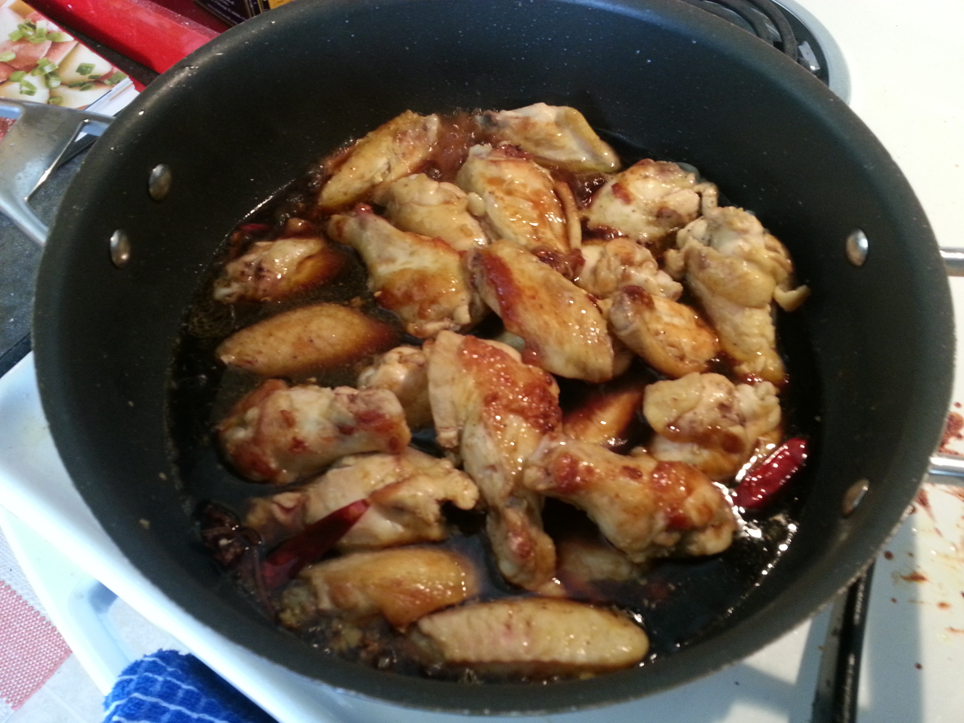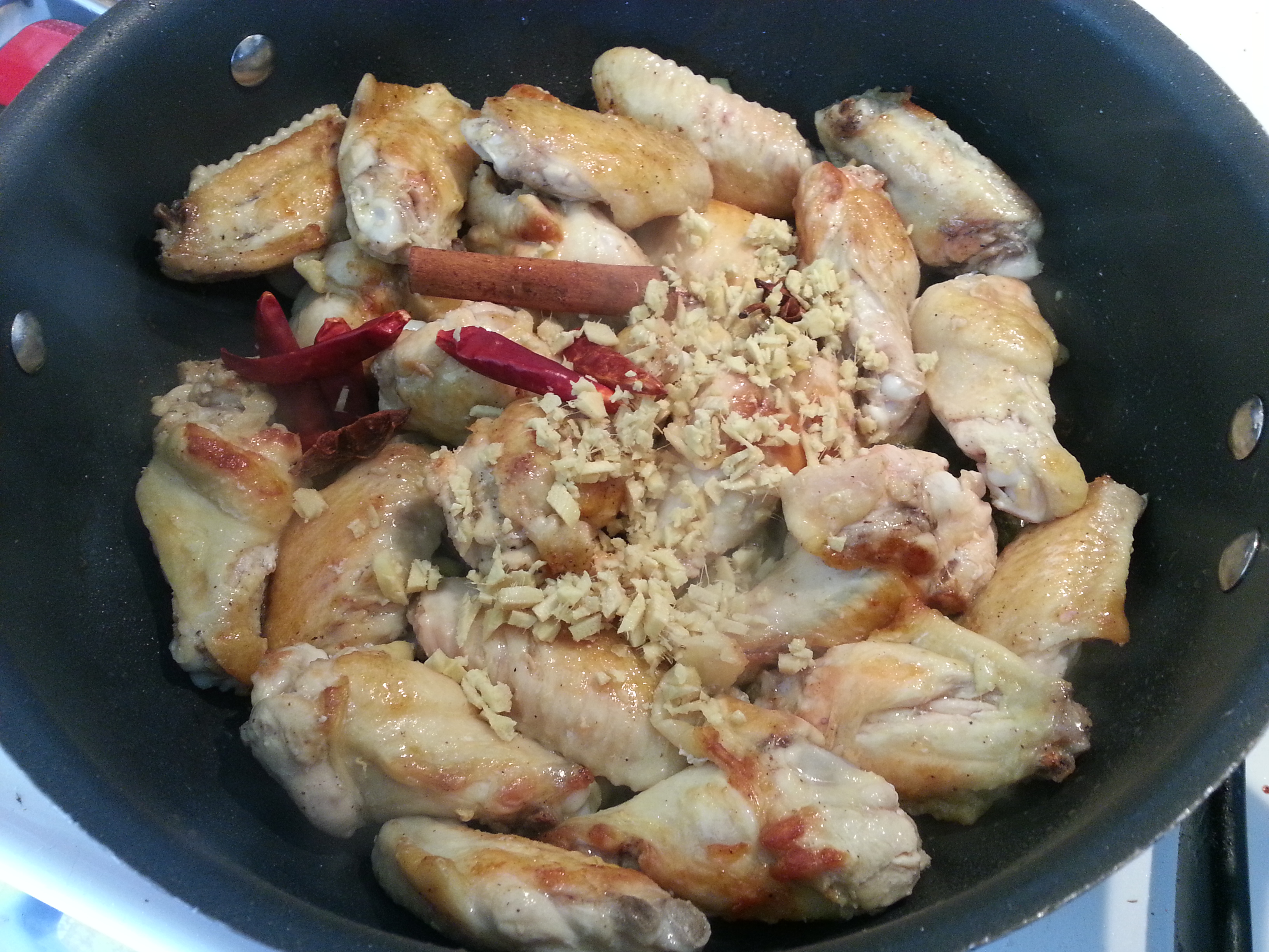 In a large nonstick frying pan, cook the chicken wings over moderate heat, turning once, until golden, about 10 mintues fro a single batch. Add the ginger, chiles, star anise and cinnamon and cook over moderately low heat, stirring, until fragrant, about 1 minute.