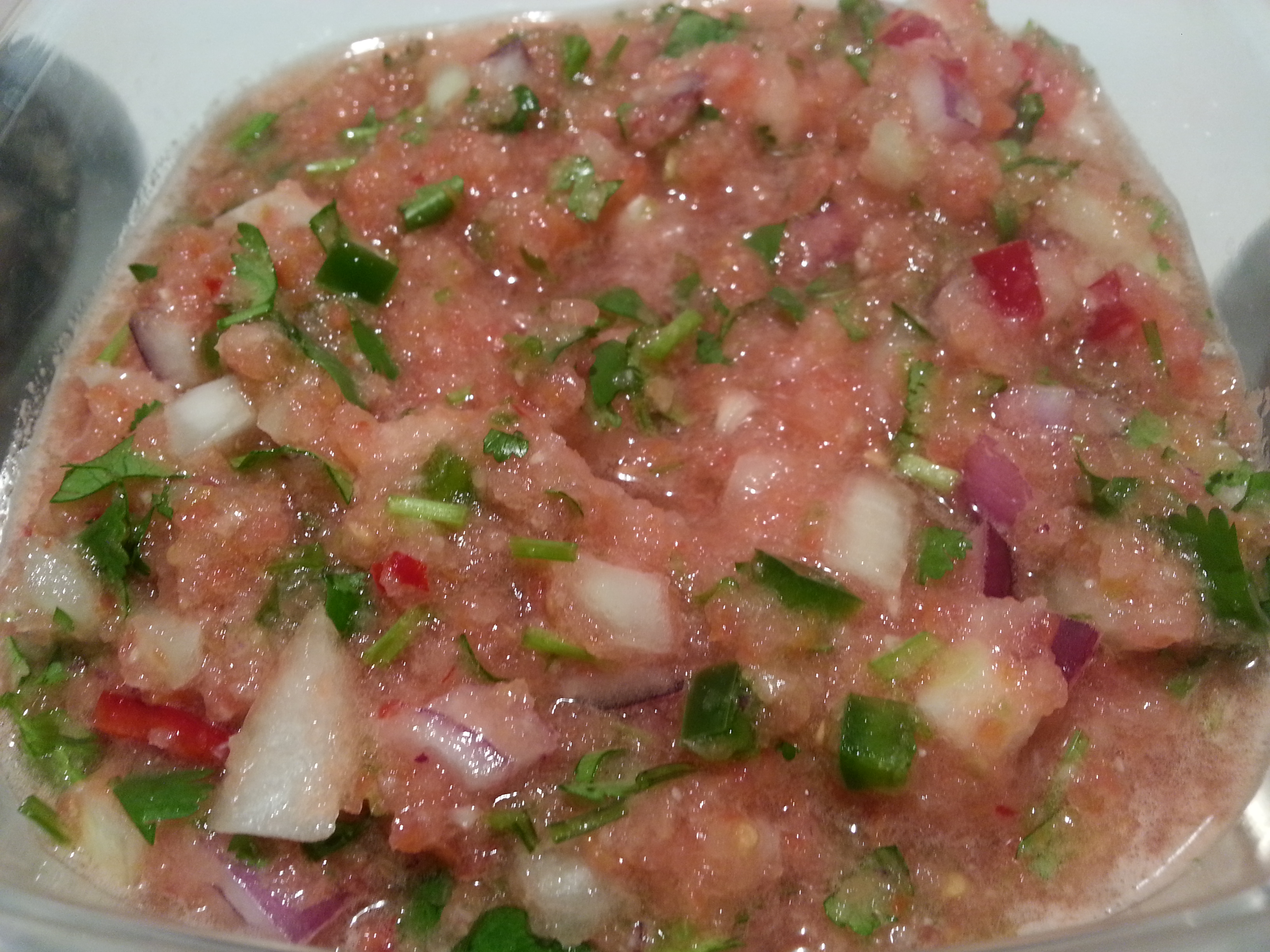 I’ve found that pureeing part of the measures of onion and jalapeno into the tomato mixture is a great way to distribute the flavors evenly, and still incorporate some nice texture with the reserved (finely chopped) portion.