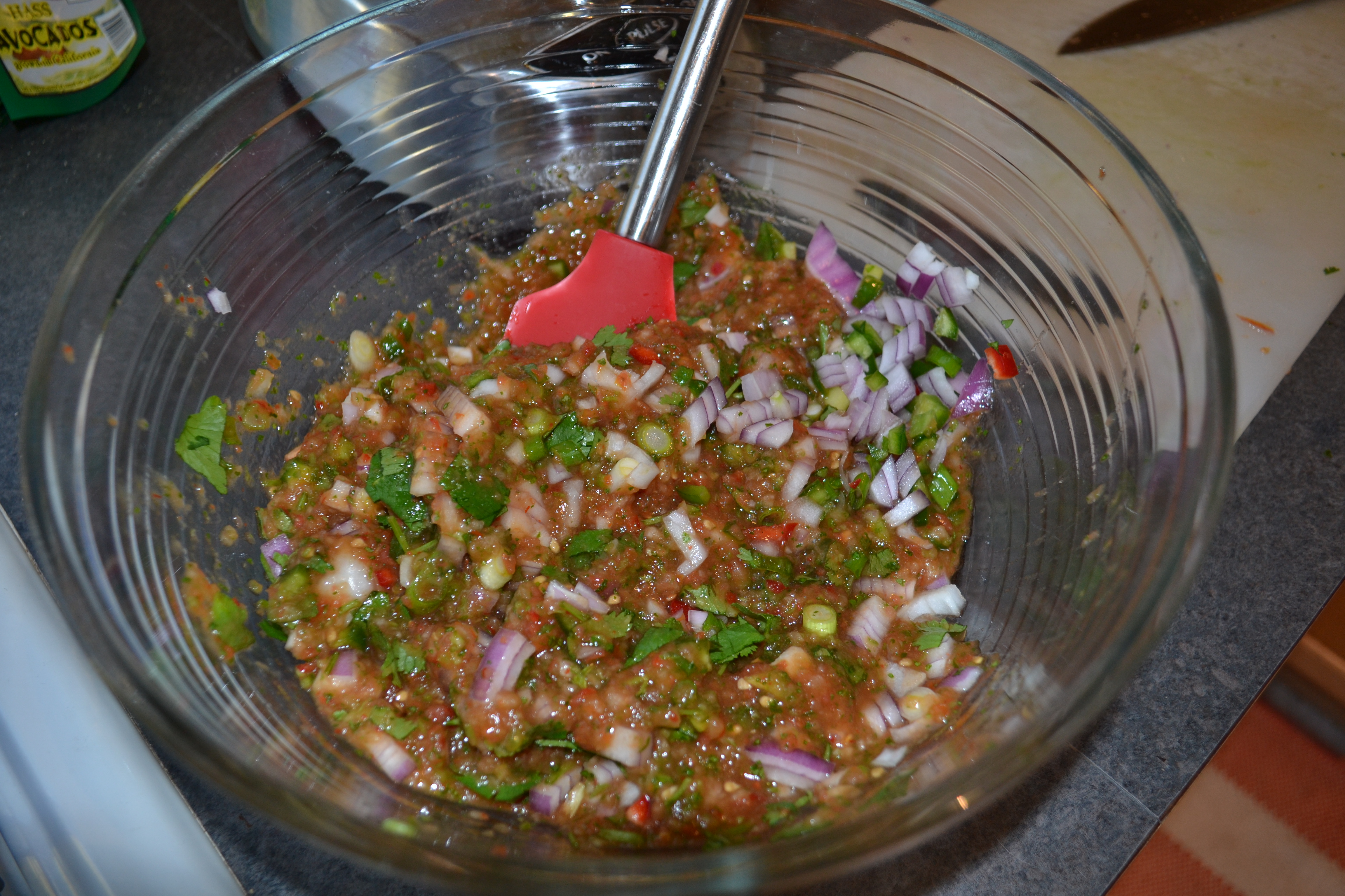 I tried to chop the remaining ingredients, specifically the onions and jalapenos, as uniformly as possible. A chop like that will give the entire mixture an even texture, and insure that the spicier chunks won’t be too big, or overwhelm the other flavors.
