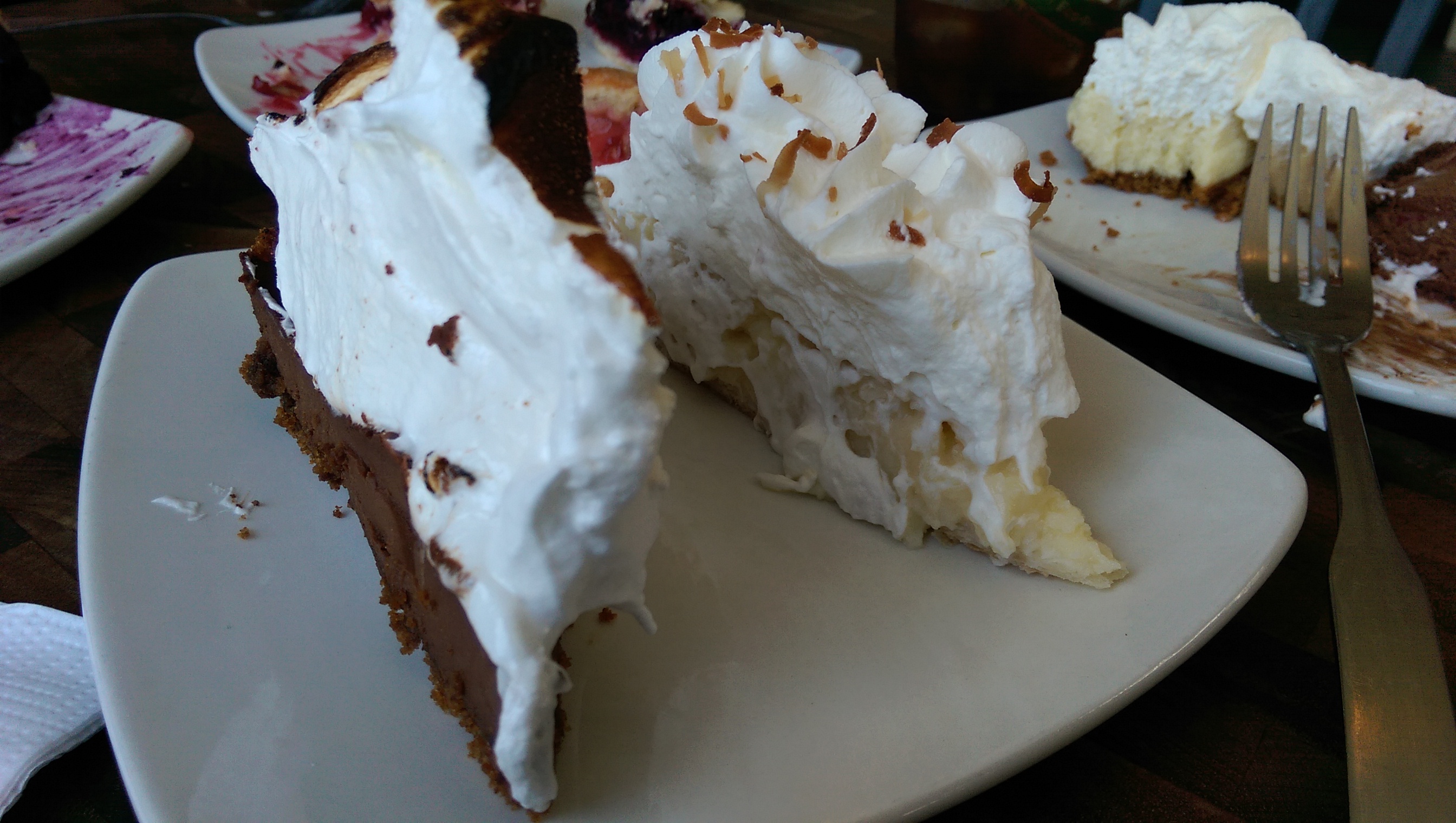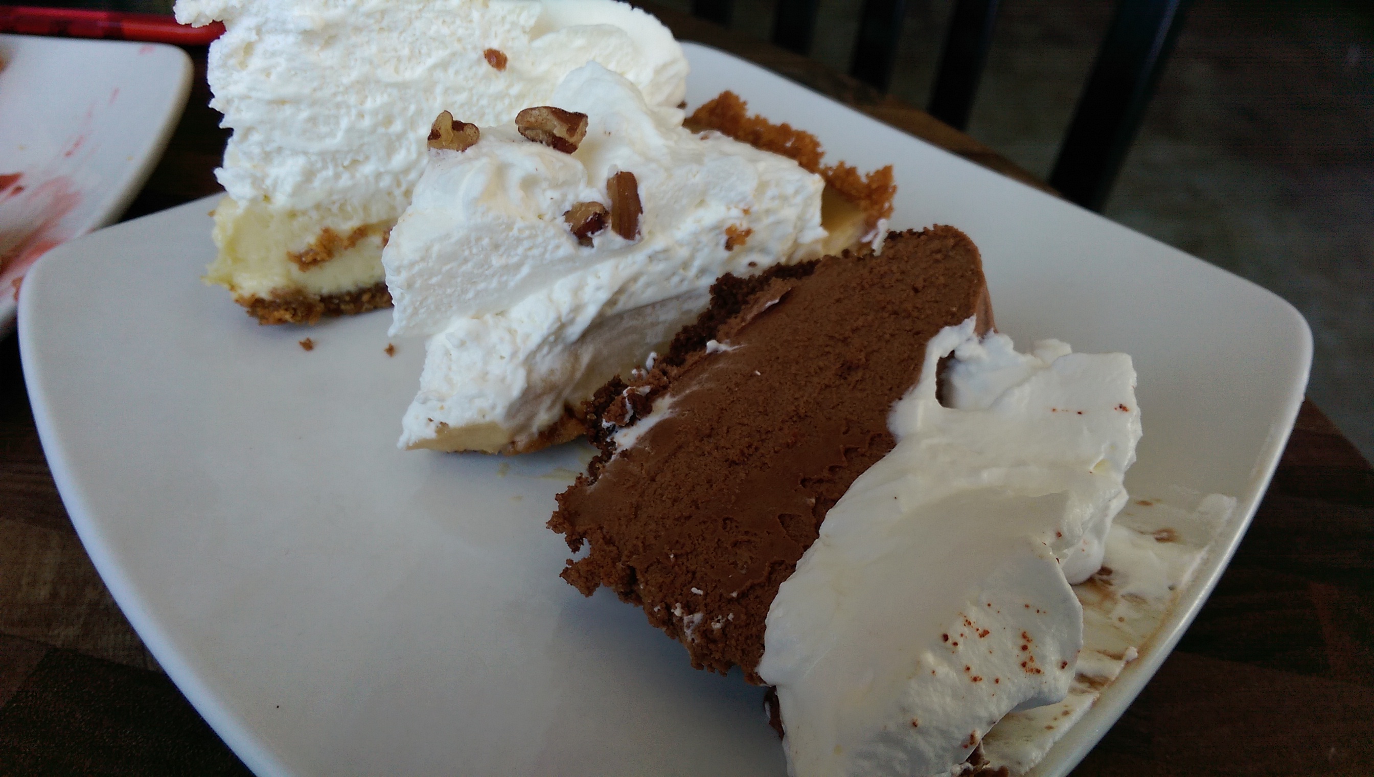 The final round, which we were shamefully too stuffed to finish, was a slice each of coconut creme and one of their new creations, a S’Mores-inspired pie made with smoked chocolate. It could have just bee that it was the last thing I tried to eat, but the S’Mores pie was a little rich, and a little too smoky, for my taste at the time. Of course, they were nice enough to wrap up our leftovers and send us home with a box of treats to enjoy later, which is why I can say – definitively – that the S’Mores pie makes a wonderfully rich breakfast wen consumed alongside a cup of coffee and an episode of Dexter. Note: Dexter isn’t necessary for the pie to be good for breakfast.