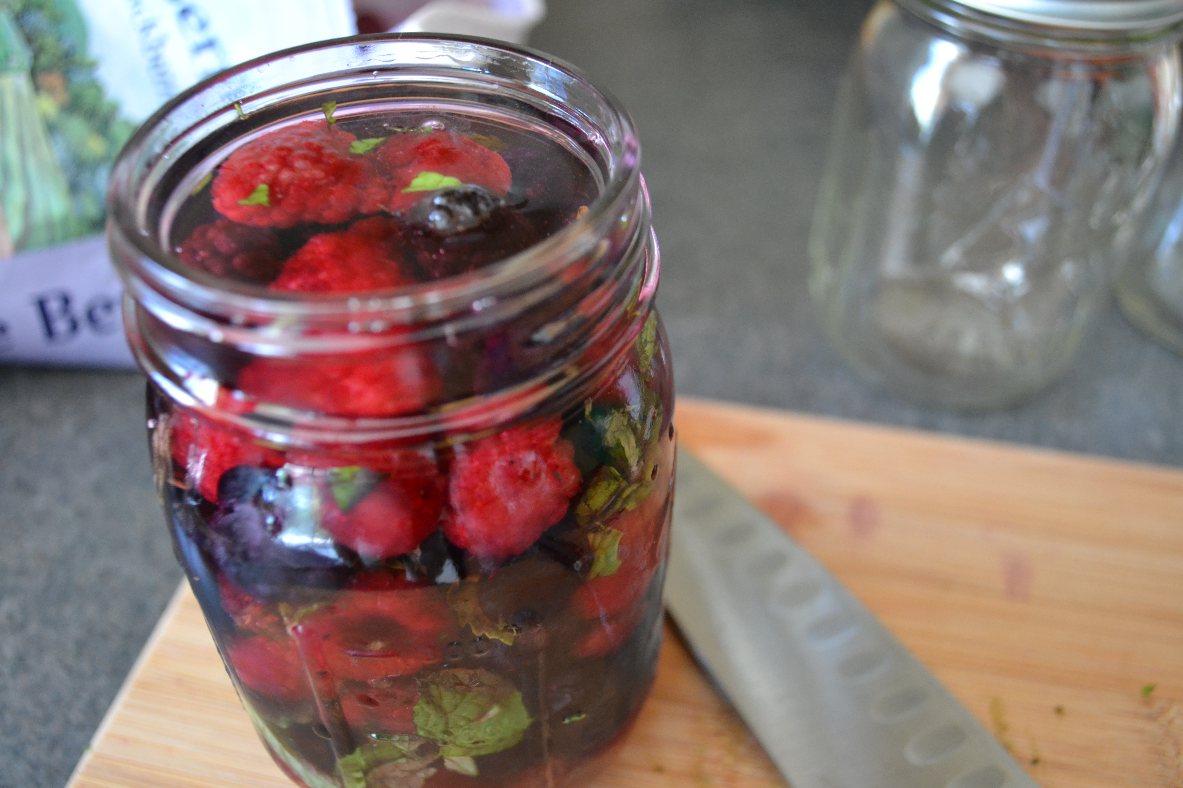 I filled the jar nearly to the top with the frozen berry mixture, tossed in the mint, and topped it up (right to the rim) with the vodka.