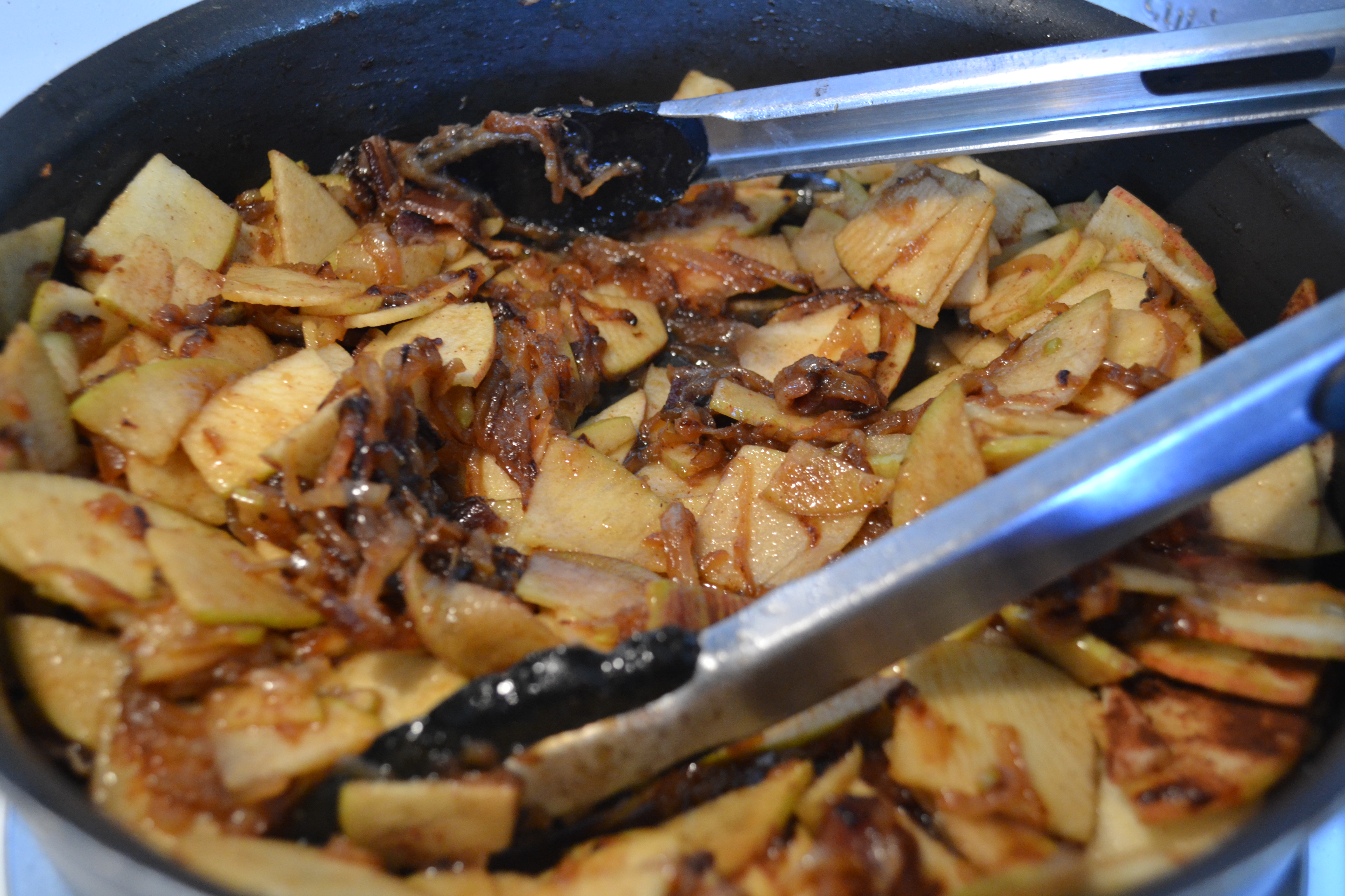 After the onions are sufficiently caramelized (I let mine go for just over half an hour), stir in the thinly-sliced apple, maple syrup, bourbon, cinnamon and bacon, and stir to combine.