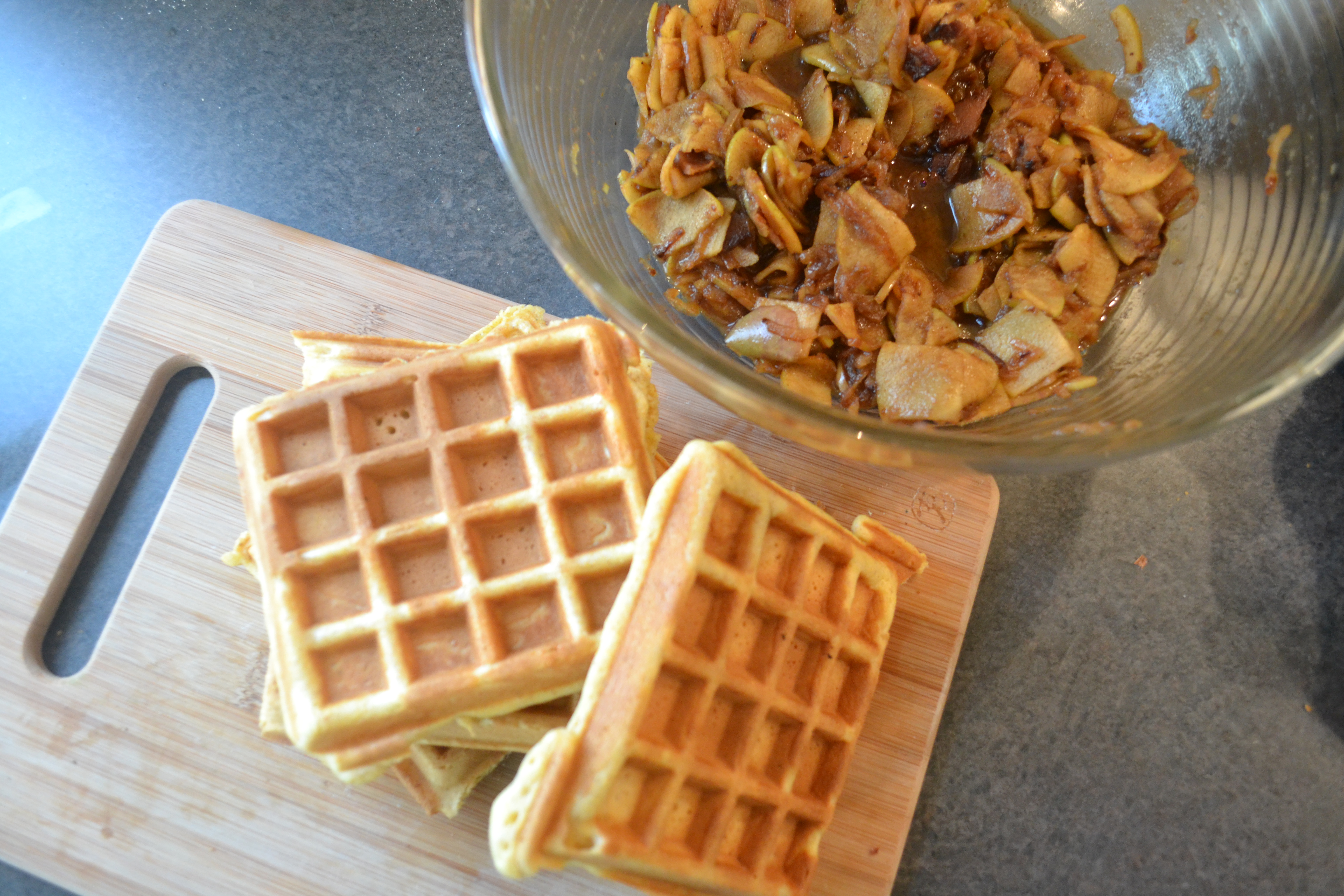 My cornbread waffles with pulled chipotle chicken and onion-apple chutney