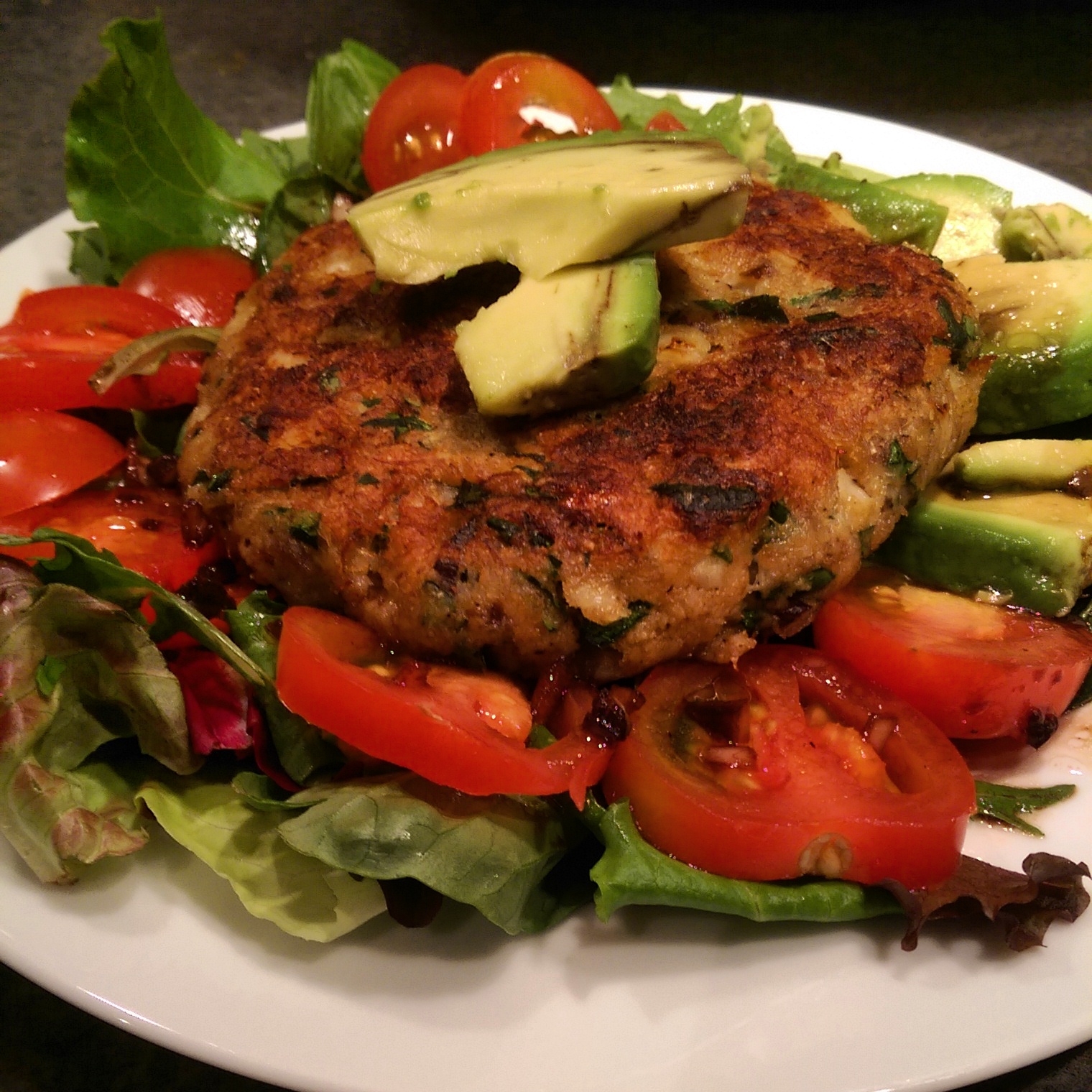 Serve over a bed of greens with a few slices of tomato and avocado, and a drizzle of vinaigrette.