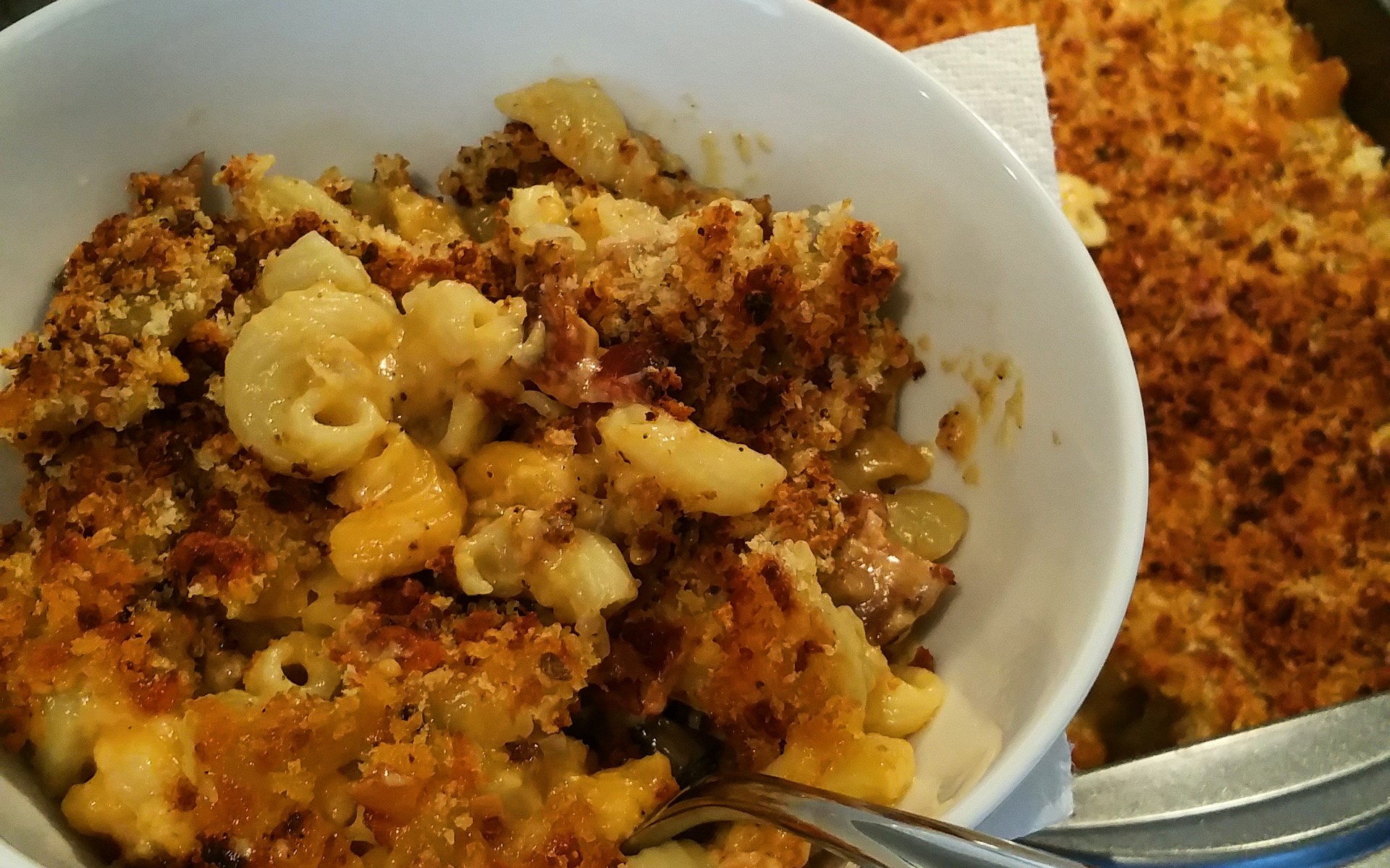 Fuck it, let’s make the topping first. Tear up the two hot dog rolls, and drop them in the food processor with the reserved 1/4 cup of cheese. Pulse the bread and cheese until large bread crumbs form. Done. Moving on.