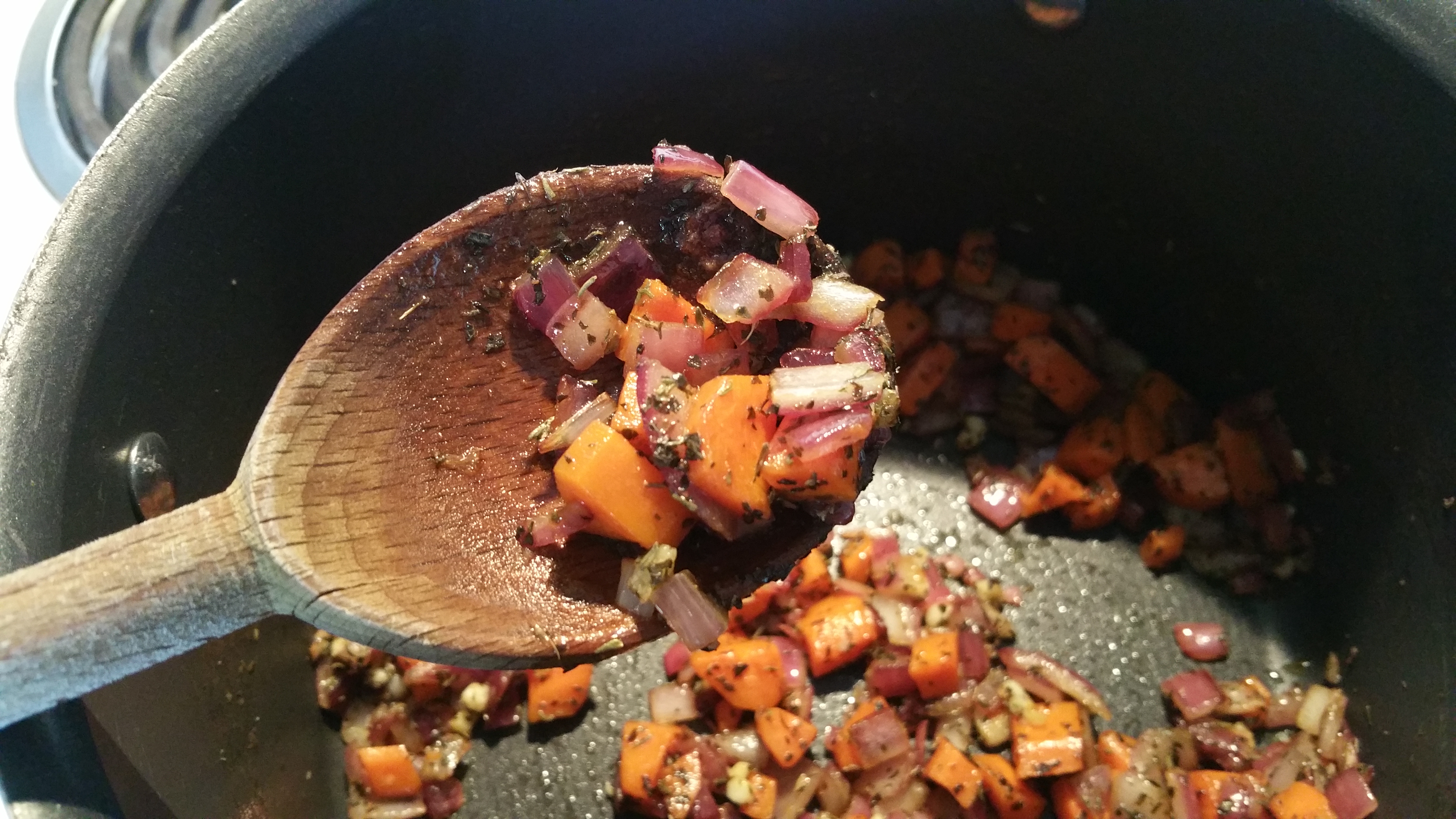 When the oil is hot, add the onions and carrots. Saute the vegetables, stirring occasionally, for 3-4 minutes or until they’re just softened.