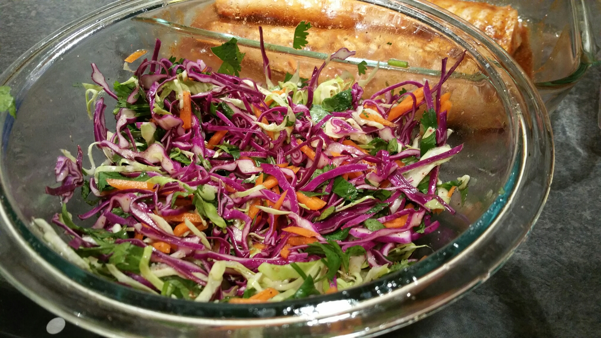 Set the spice-rubbed fish aside for a few minutes as you make the slaw, by combining all of the listed ingredients in a large bowl, and tossing them together with utensils, or get dirty and use your hands.