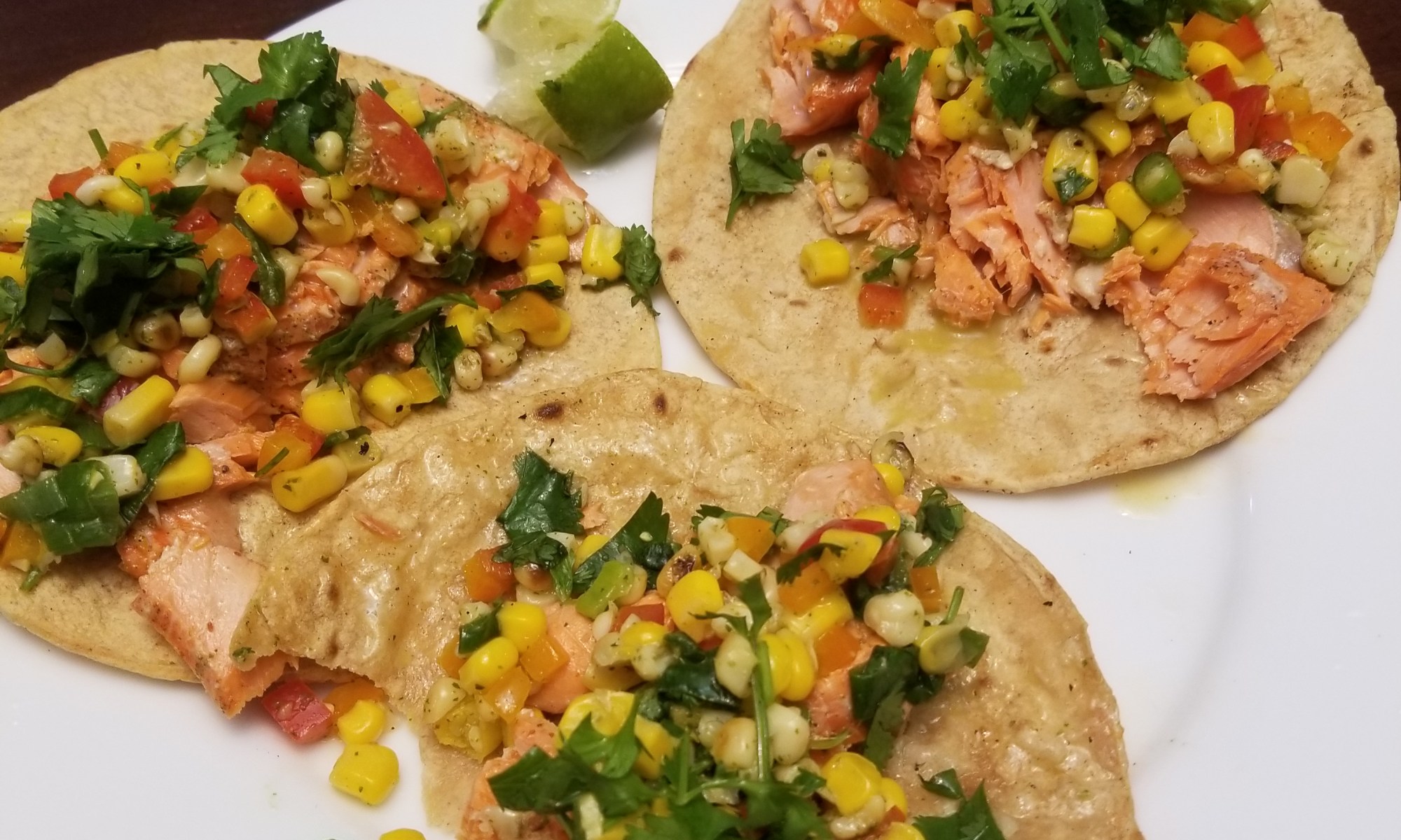 At this point you have two choices; you can (A) toss in the lime juice, olive oil, and cilantro as-is, which will be delicious, or (B) blend together the lime juice, oil and cilantro (and a dash of salt and pepper) into a simple dressing. I originally made this choice so I could use the dressing to cook some salmon as well, but it turned out to be a delicious addition to the corn mixture.