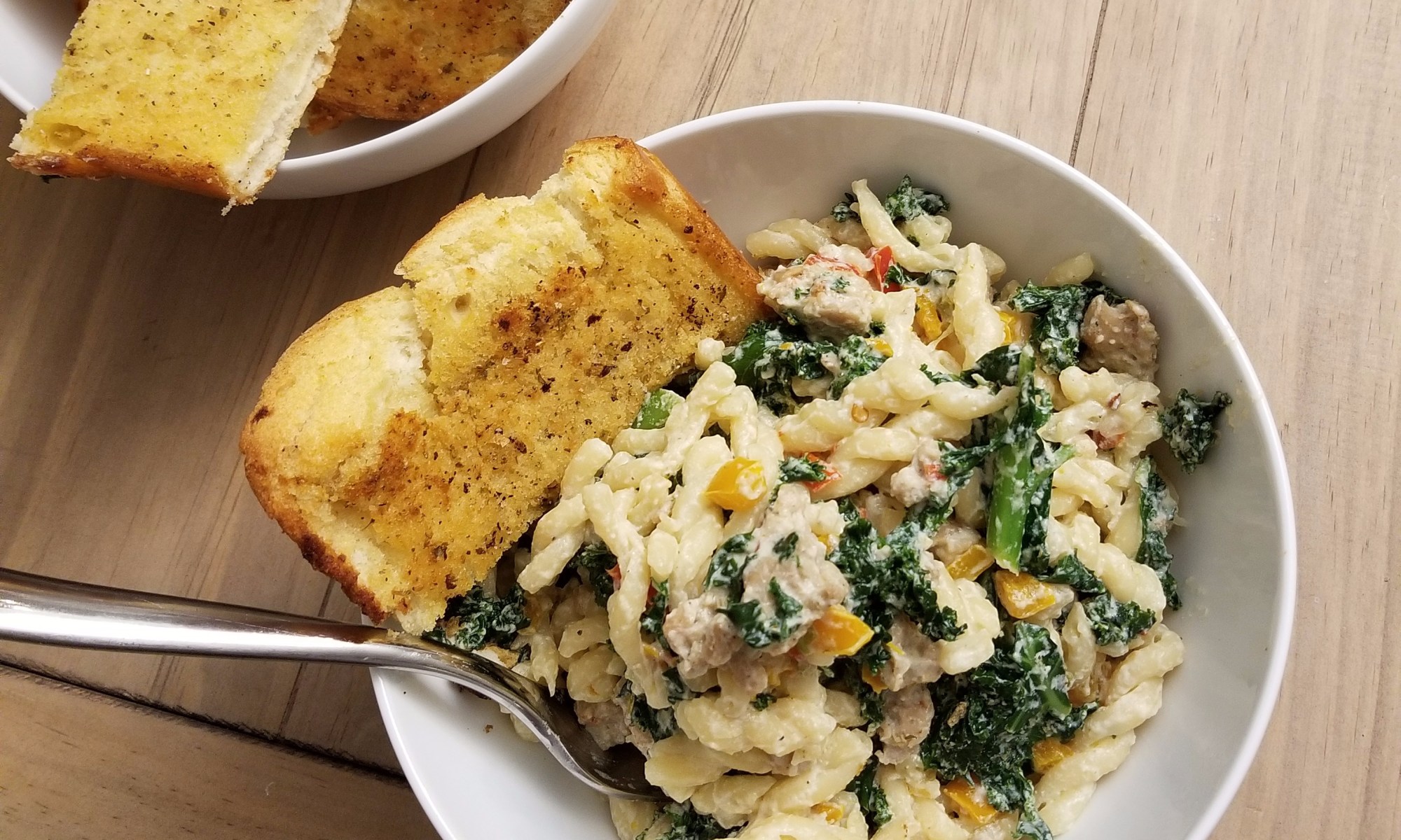 - Dump EVERYTHING (the cooked pasta, the kale and sausage mixture, the ricotta cheese, and the other 1/2 cup of reserved pasta water) into the big pasta pot (or some other giant vessel) and fold it all together. if you want to return it to the heat (if the pasta cooled off too much), now’s the time to do it, just make sure to keep stirring so it doesn’t burn!