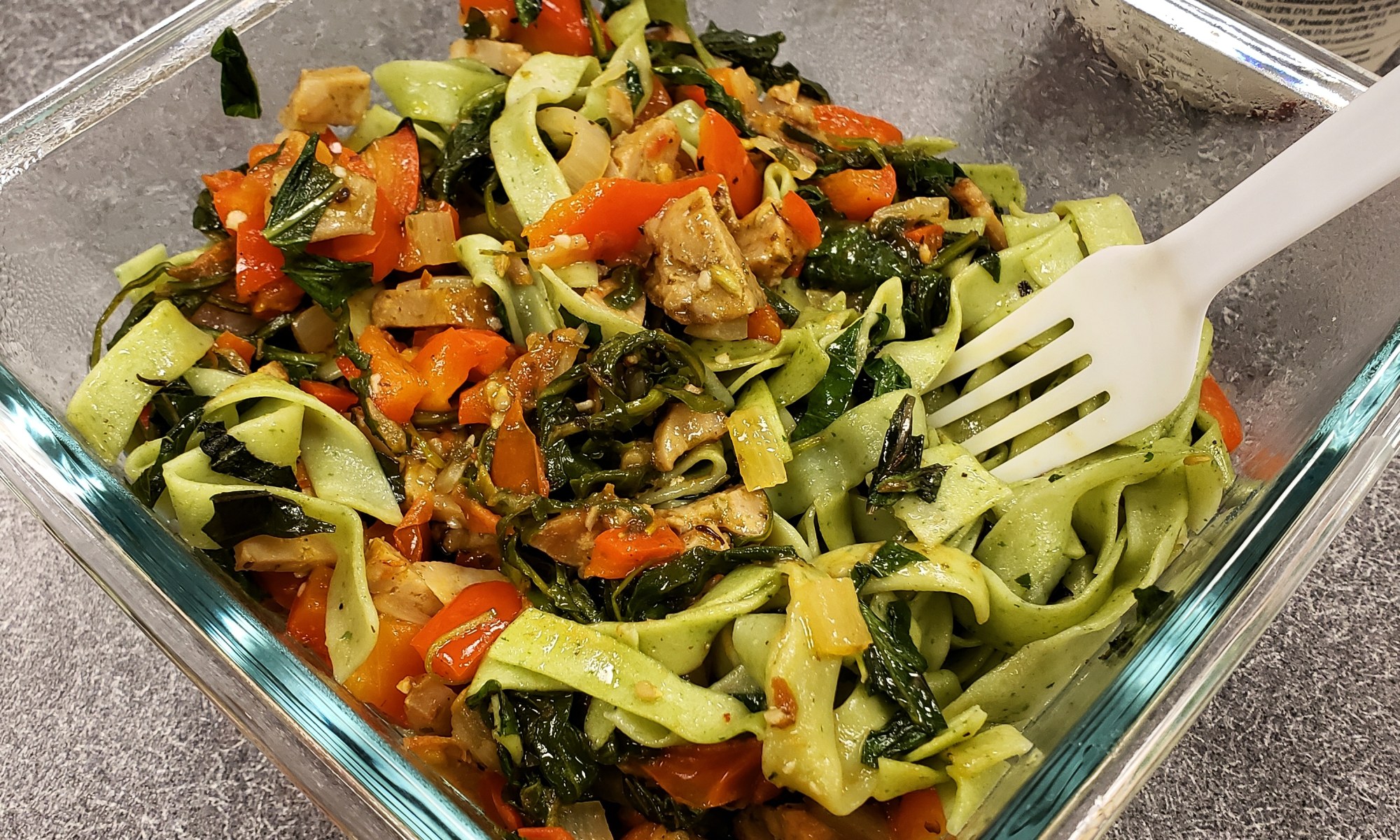 - Fold the veggie/sausage mixture into the reducing arugula for 1-2 minutes, integrating the flavors, and allowing the greens to finish wilting. Add more water and/or oil if the mixture starts looking or feeling dry.
