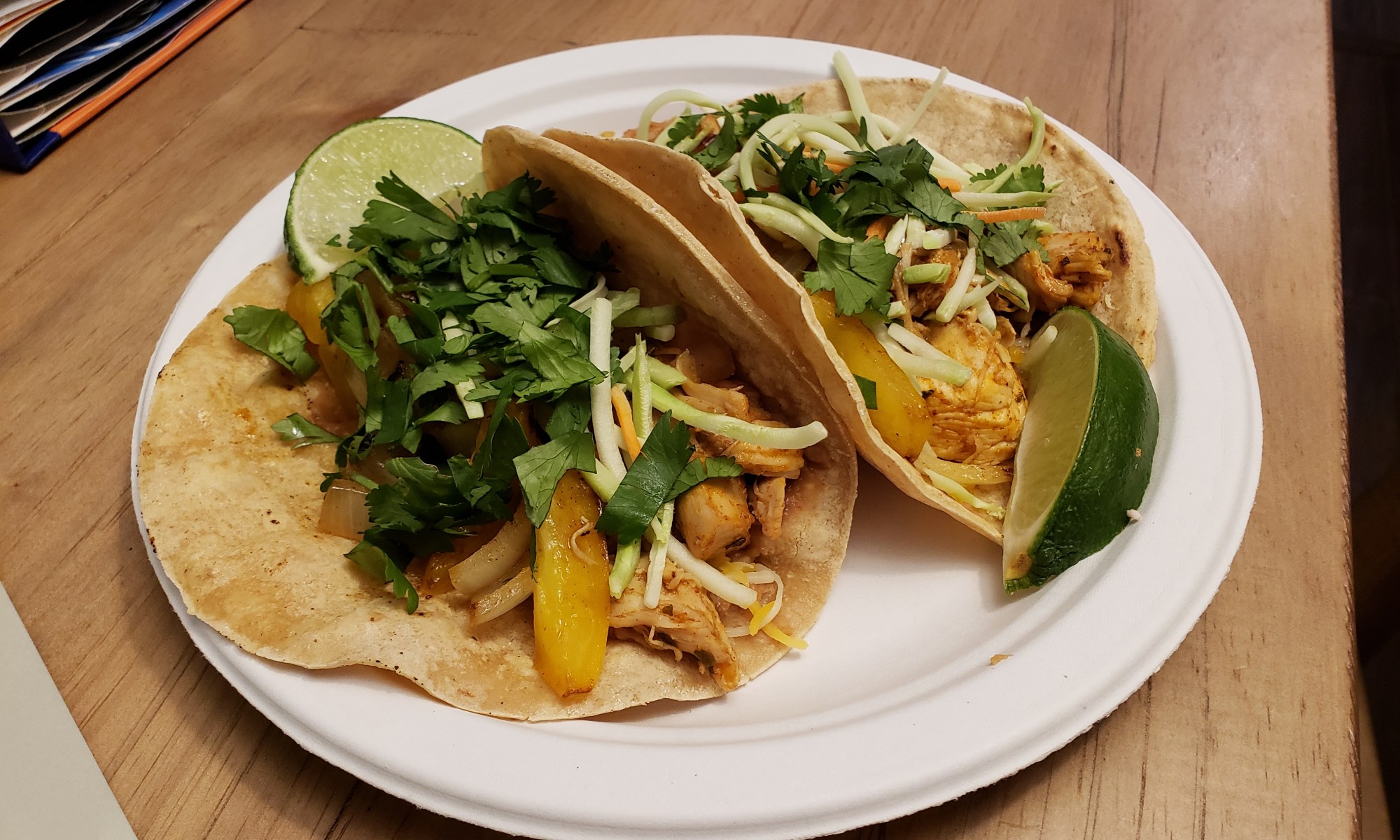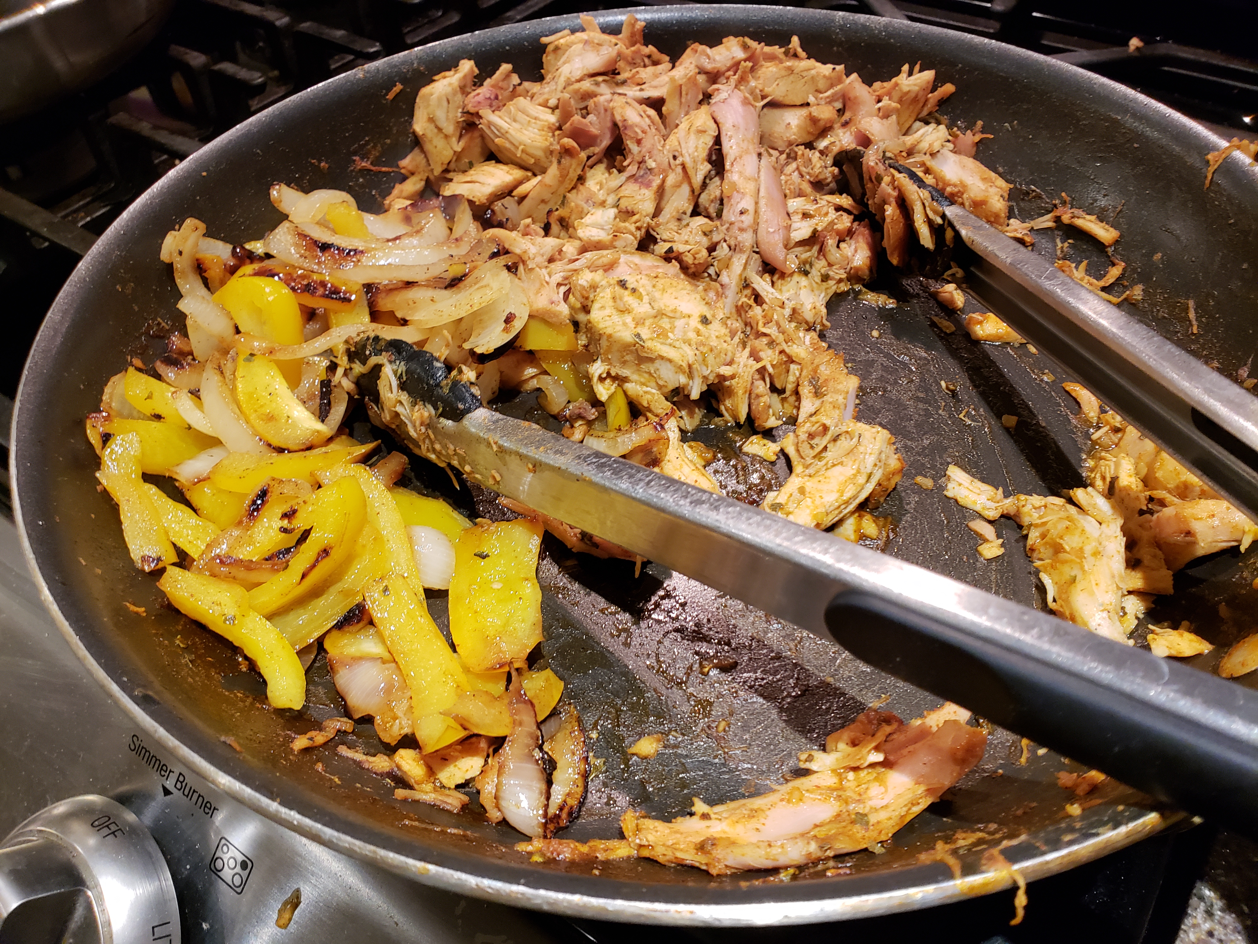 - Once the onions and peppers are soft and slightly browned, and the chicken is nicely coated with the spice sauce, remove it all from the heat, and serve it in tortillas with some cheese and whatever other additions you prefer.