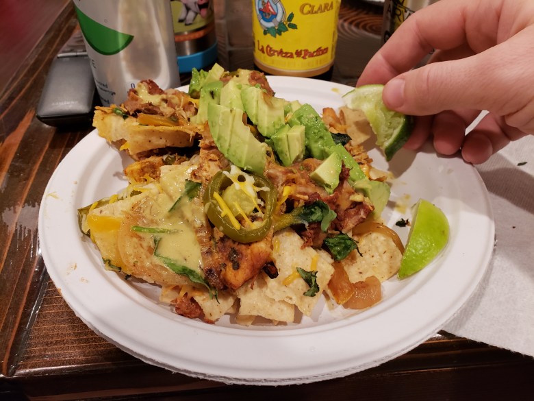 In this case, it was really simple. I pulled all the meat off the bones, discarded the carcass (a younger, child-free, me might have made a stock), and used some fresh onions, bell peppers, taco mix and a few other seasonings to make fajitas, and then used the leftover chicken and veggies later in the week to make a tray of tasty nachos (recipe below).