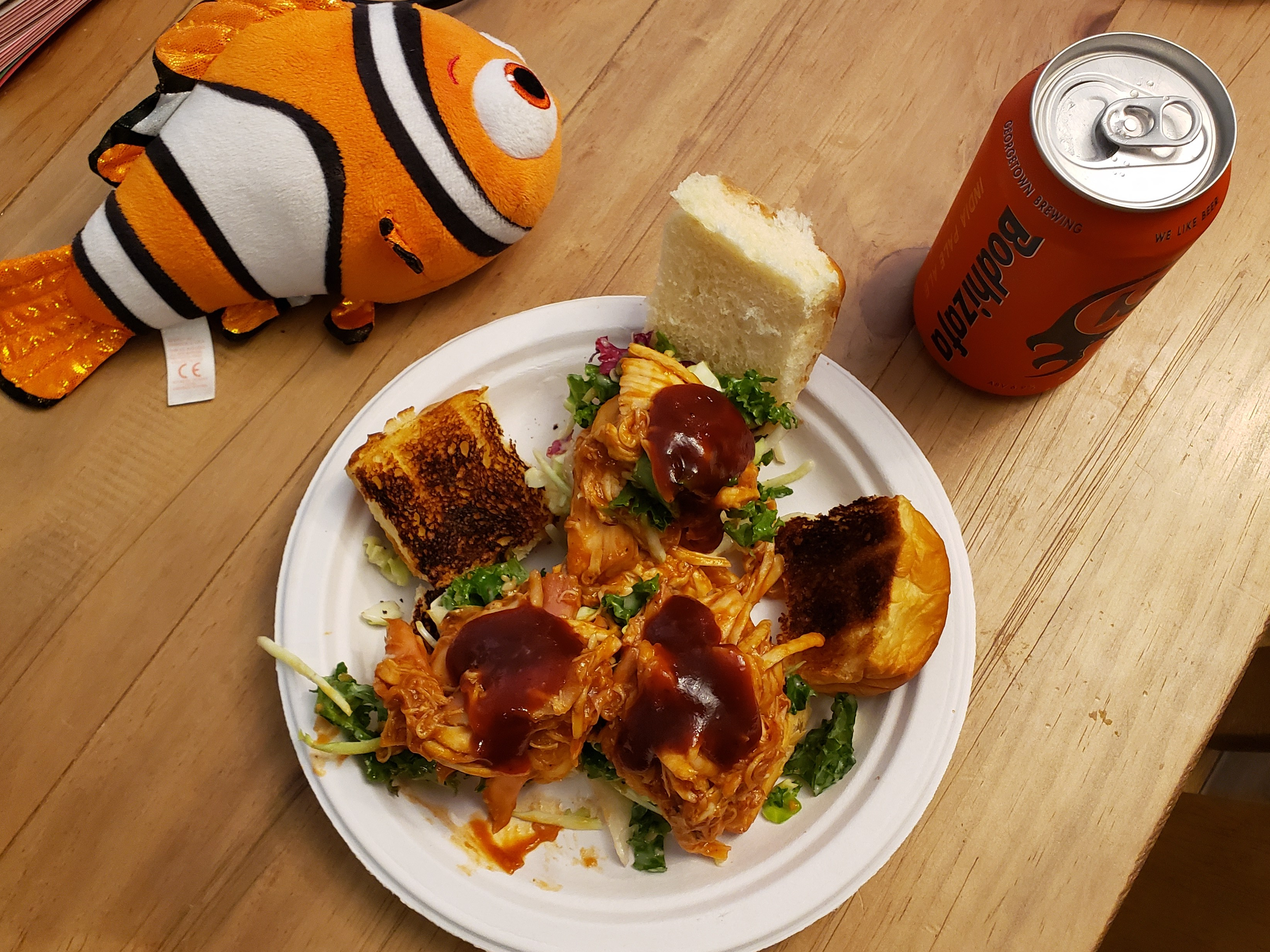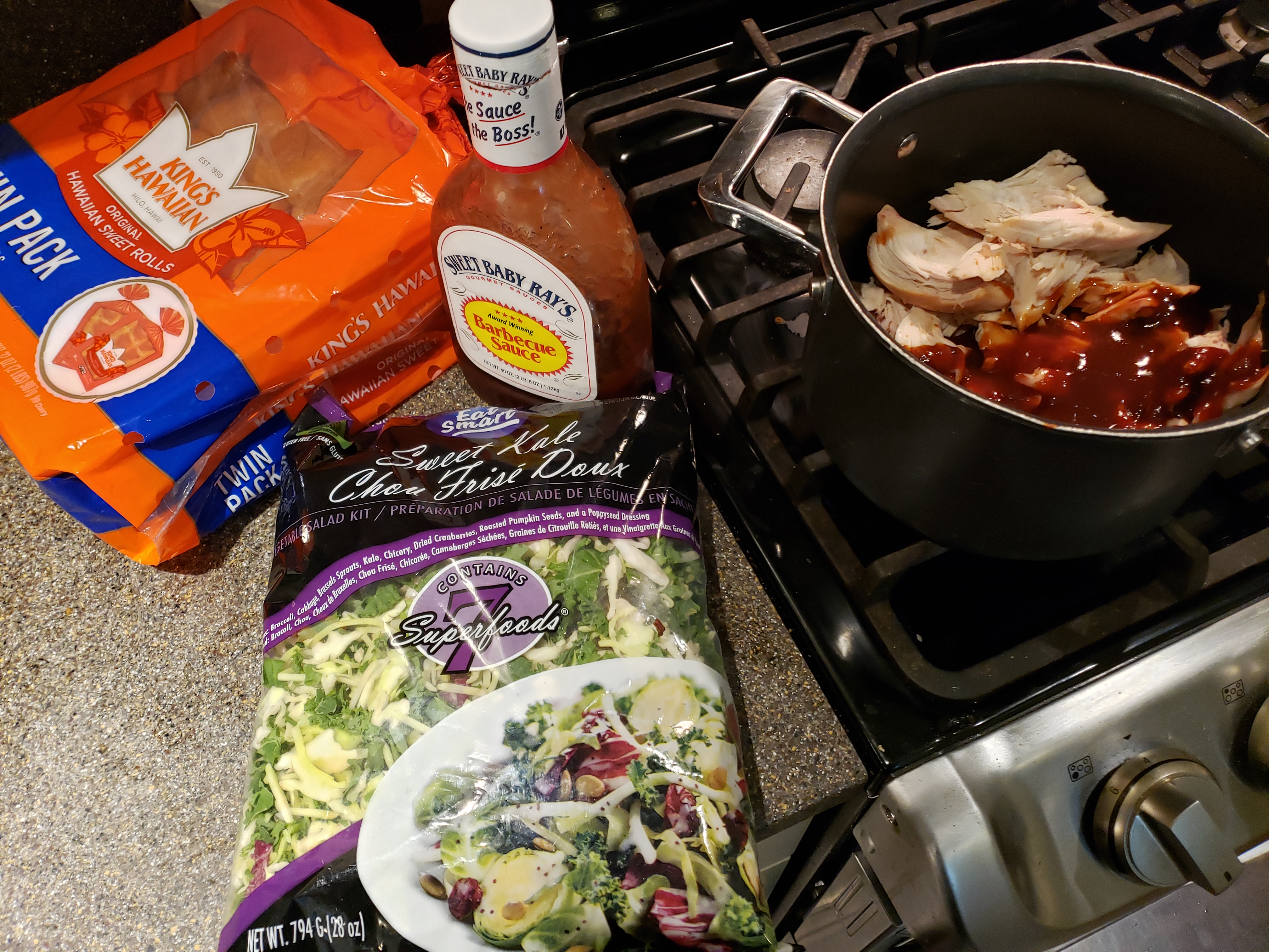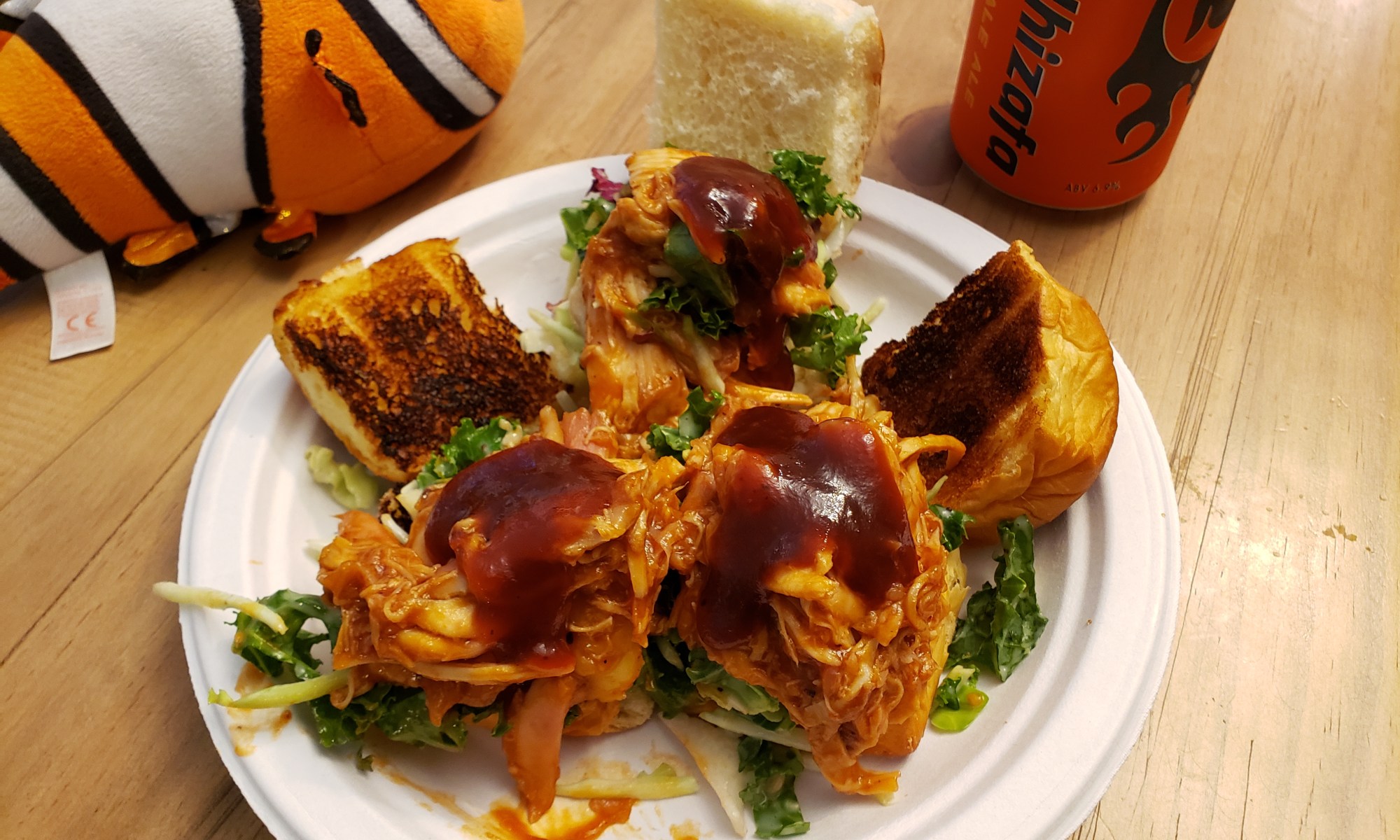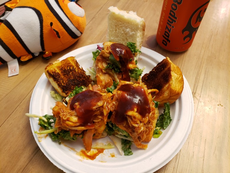 6. Assemble the sliders by placing a scoop of the BBQ chicken on the bottom half of a single toasted roll, topping it with a forkful of salad, and – if you’re feeling saucy – another blorp of Sweet Baby Ray’s.