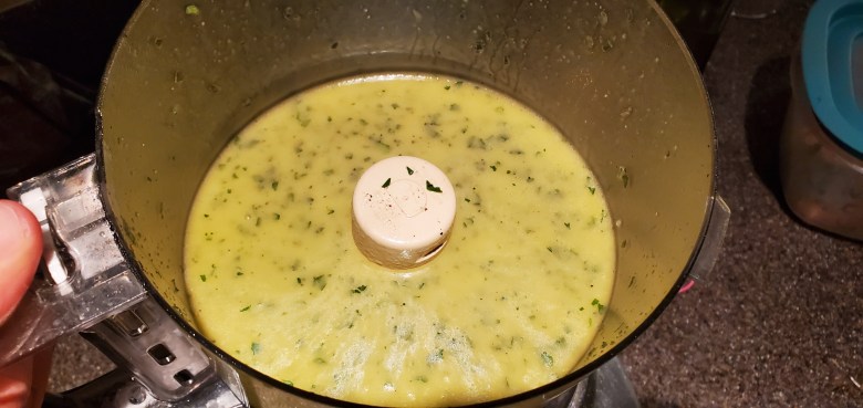 - Prepare the ingredients: mince the garlic, chop the parsley, measure out the rest. Pour the oils together into the same measuring cup/vessel.