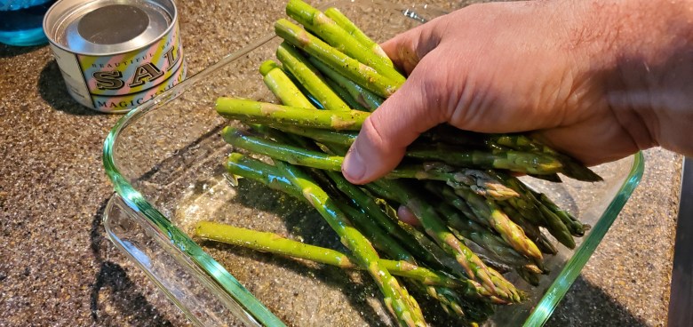 - Prep the asparagus by cutting or snapping off the hard ends, and tossing the stalks in the olive oil and the salt and pepper – I usually use use a 9×9 baking dish, because it works a lot better than a bowl for working with the long spears.