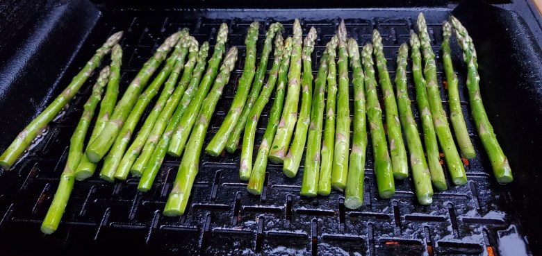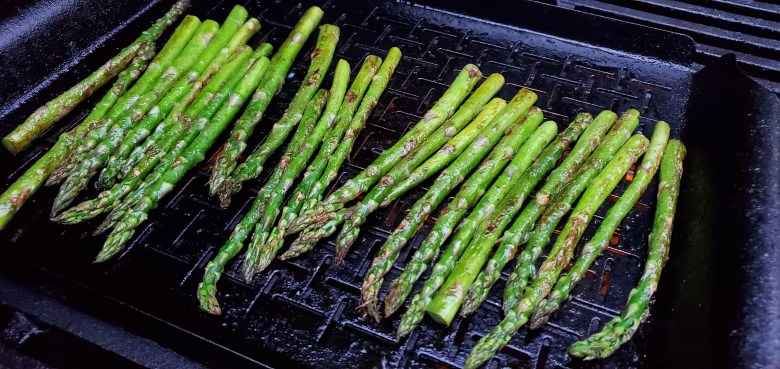 - Place the asparagus on the grill, and arrange them so they’re all touching the surface, and have a little bit of space between the spears.