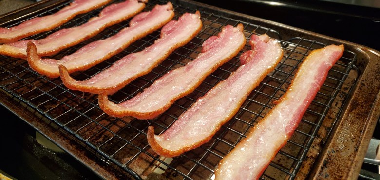 There’s and easy way to cook bacon that is consistent, and can be tailored to your individual needs: baking. By using a sheet pan, a cooling rack, and your oven, you can achieve perfectly cooked bacon in about the same amount of time, with SIGNIFICANTLY less lingering greasy smell, and (BONUS) no counter-splatter!