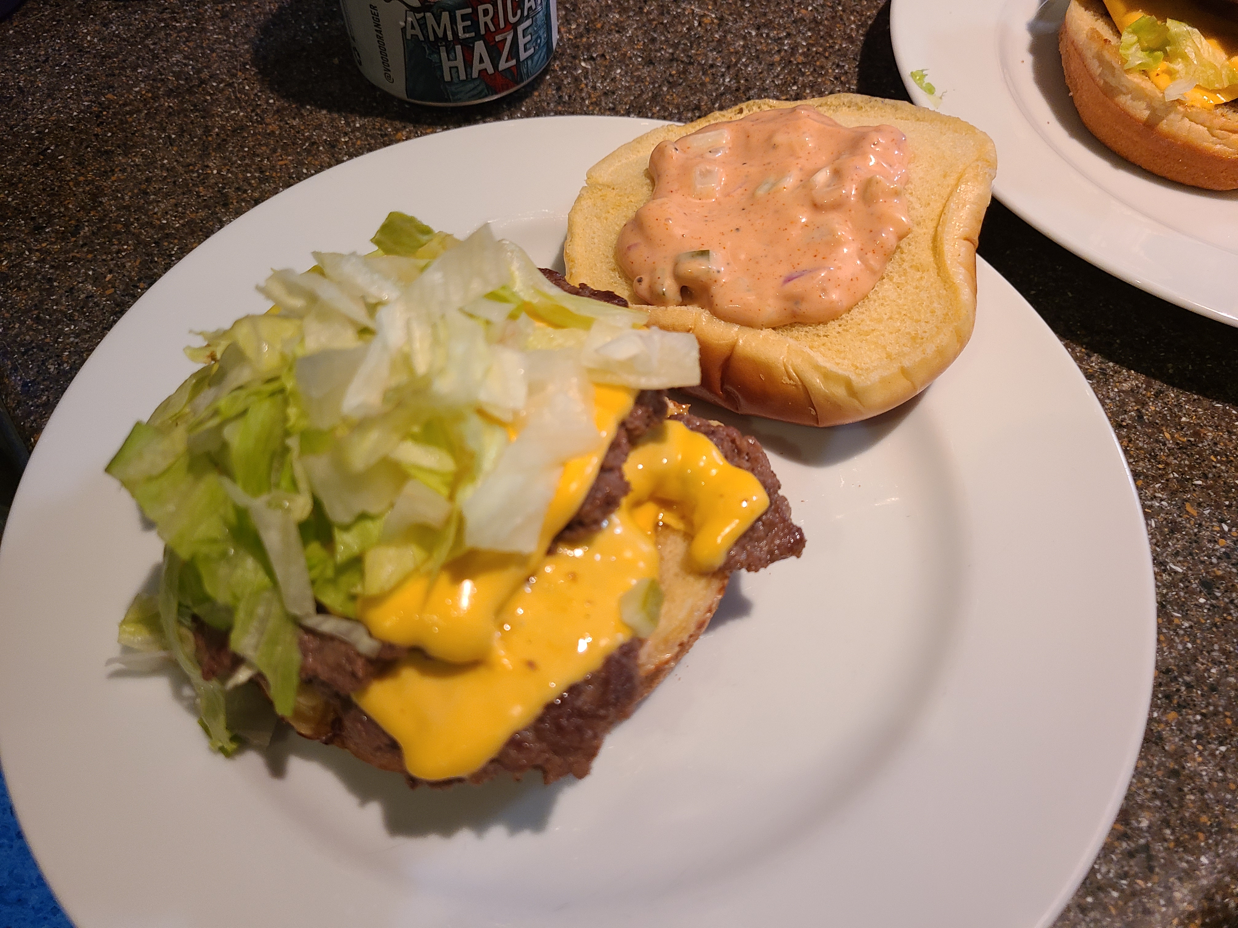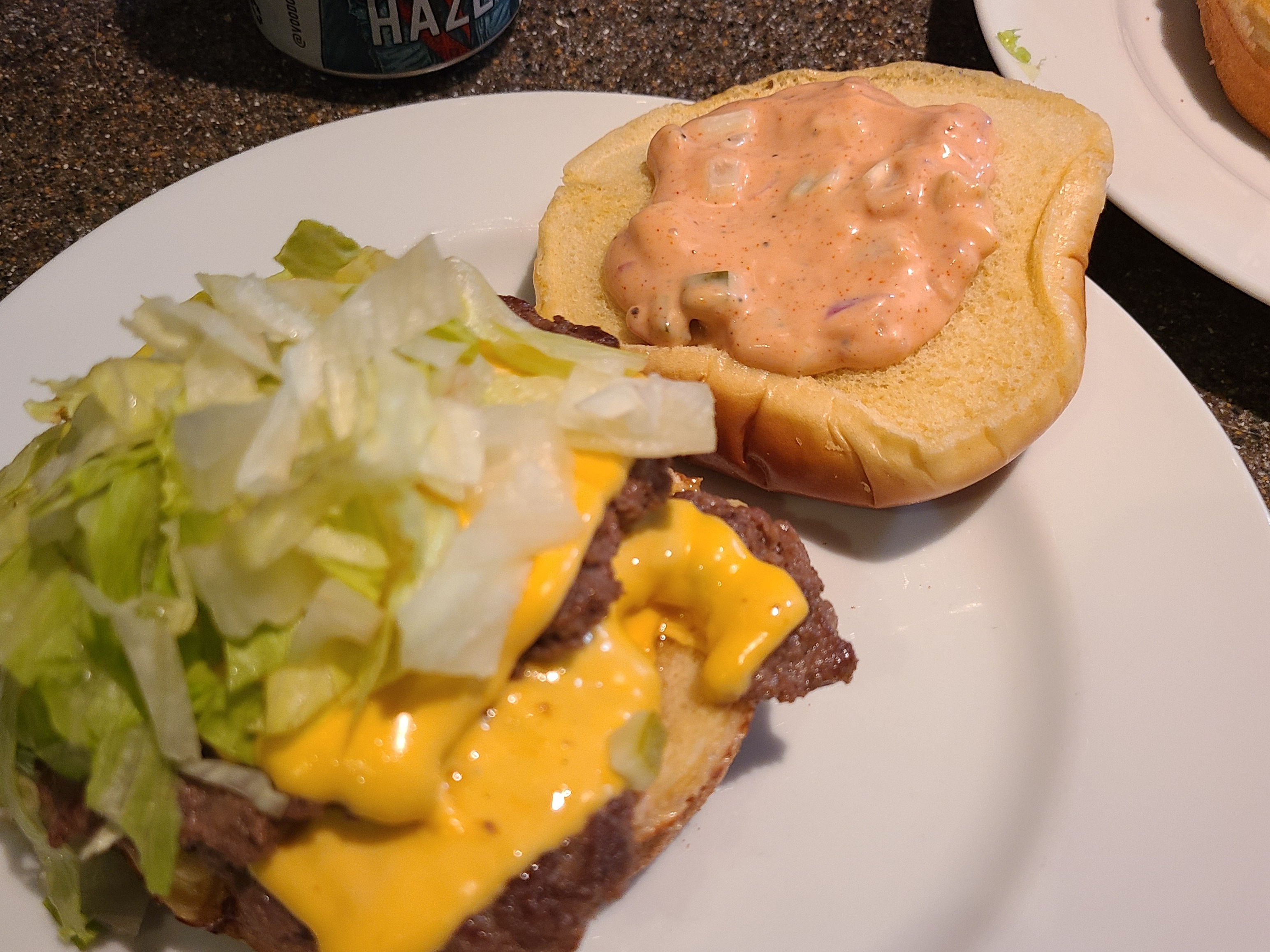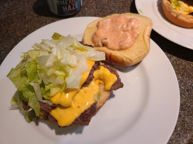First off, if you don’t know what a smash burger is, it’s pretty simple: it’s a smashed burger. I’ll post some links down at the end, so check them out, but the basic gist is that you take some fatty ground beef, smash it onto a hot griddle, and cook it until it’s crusty. Add some cheese, a classic bun, and some fancy sauce, and – OH MAN – you’ve got a tasty burger in the works.