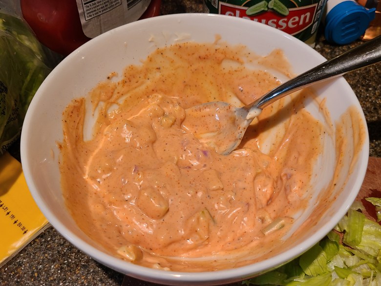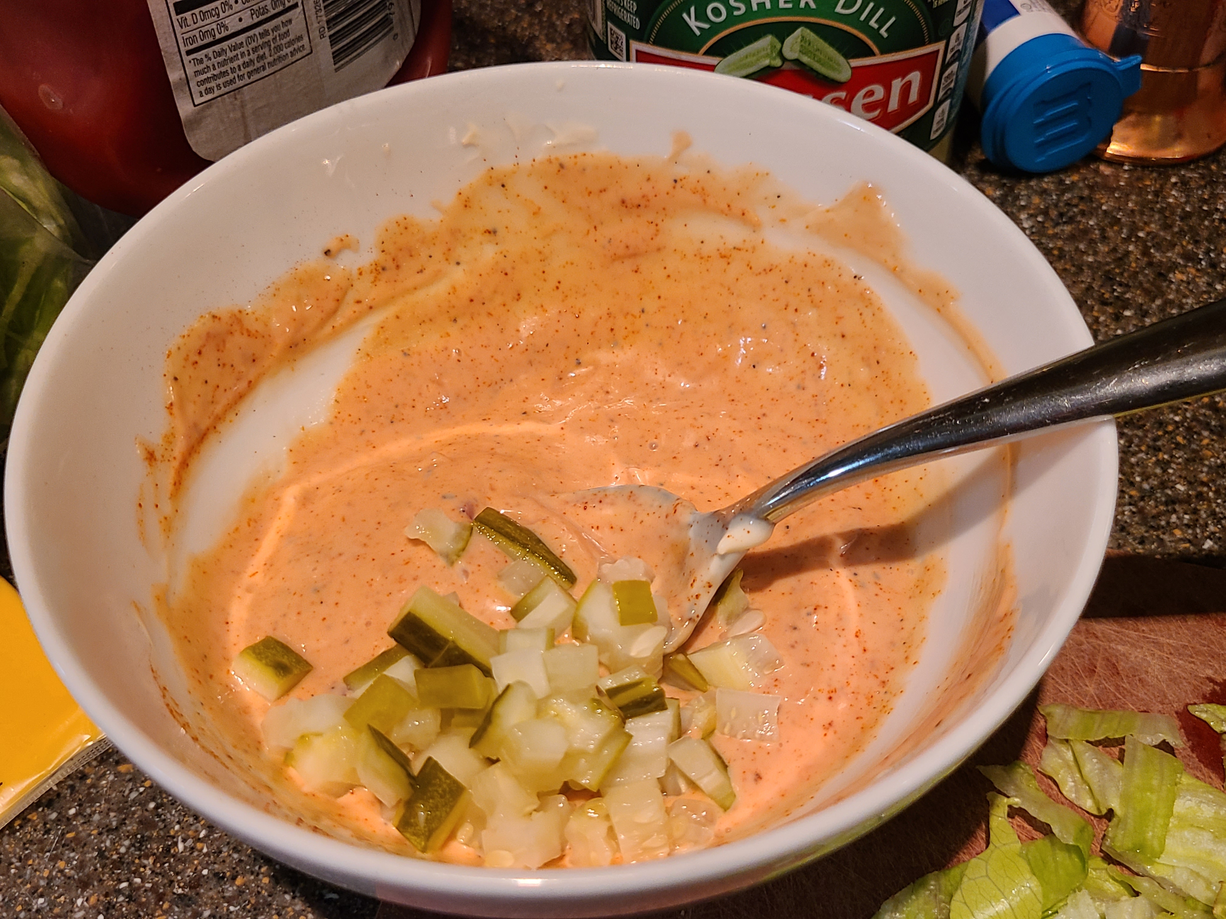 For example, my wife doesn’t like pickles, so I mix in everything but, set aside a portion for her, and then fold in the pickles and juice afterwards.