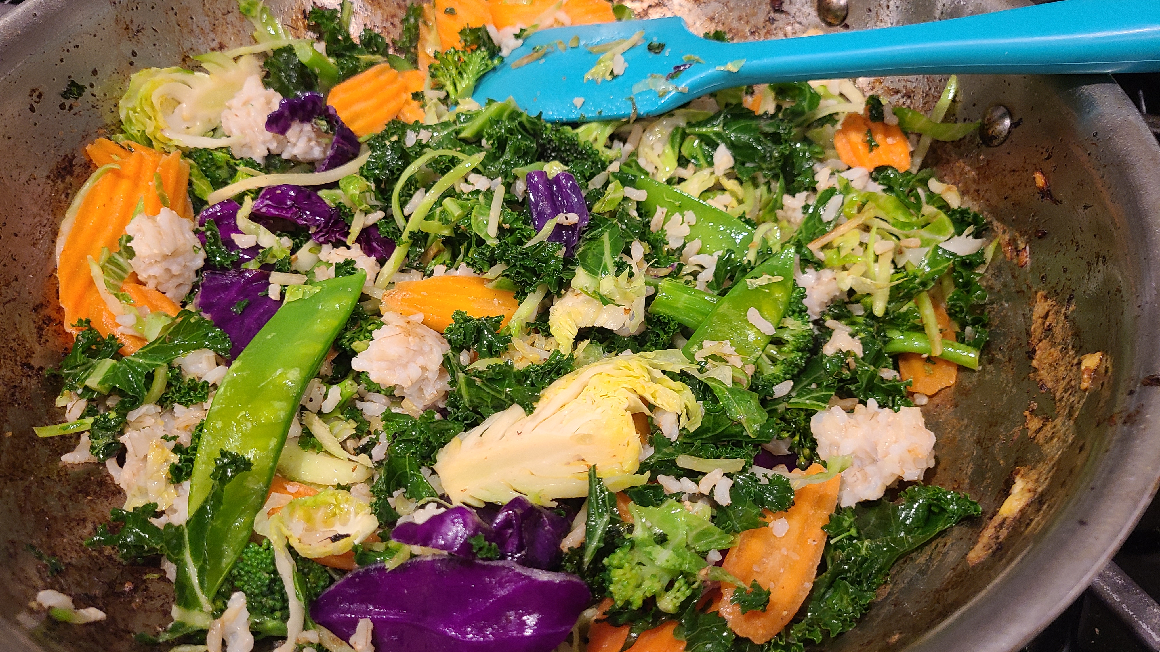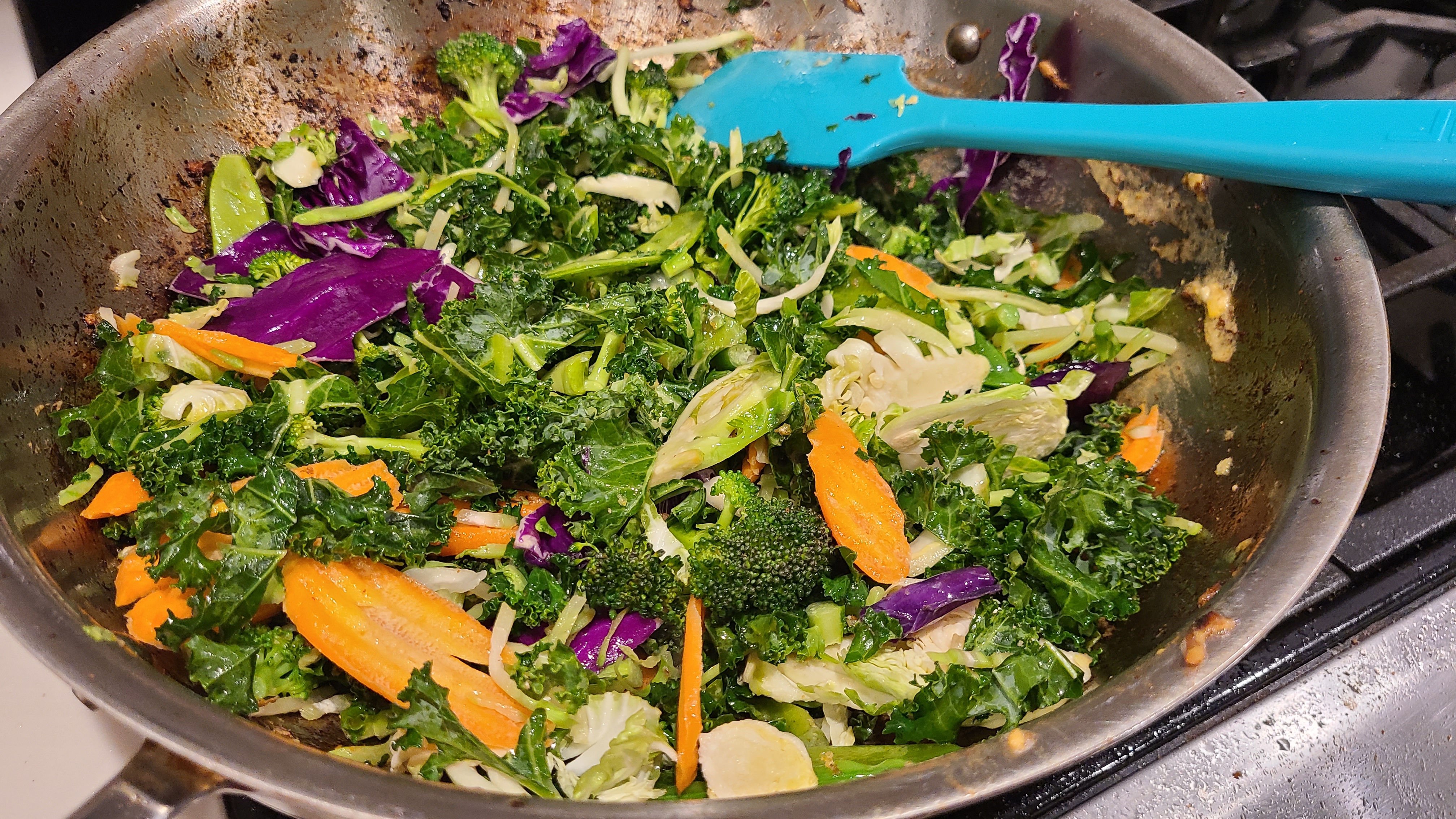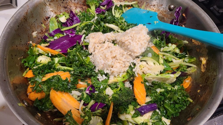 - Add oil to the pan (it’s all good if there are some remnants from the previous steps; it’s all flavor), and sauté the veggies for 3 minutes. The kale will start to cook down, and everything will get all bright and shiny.
