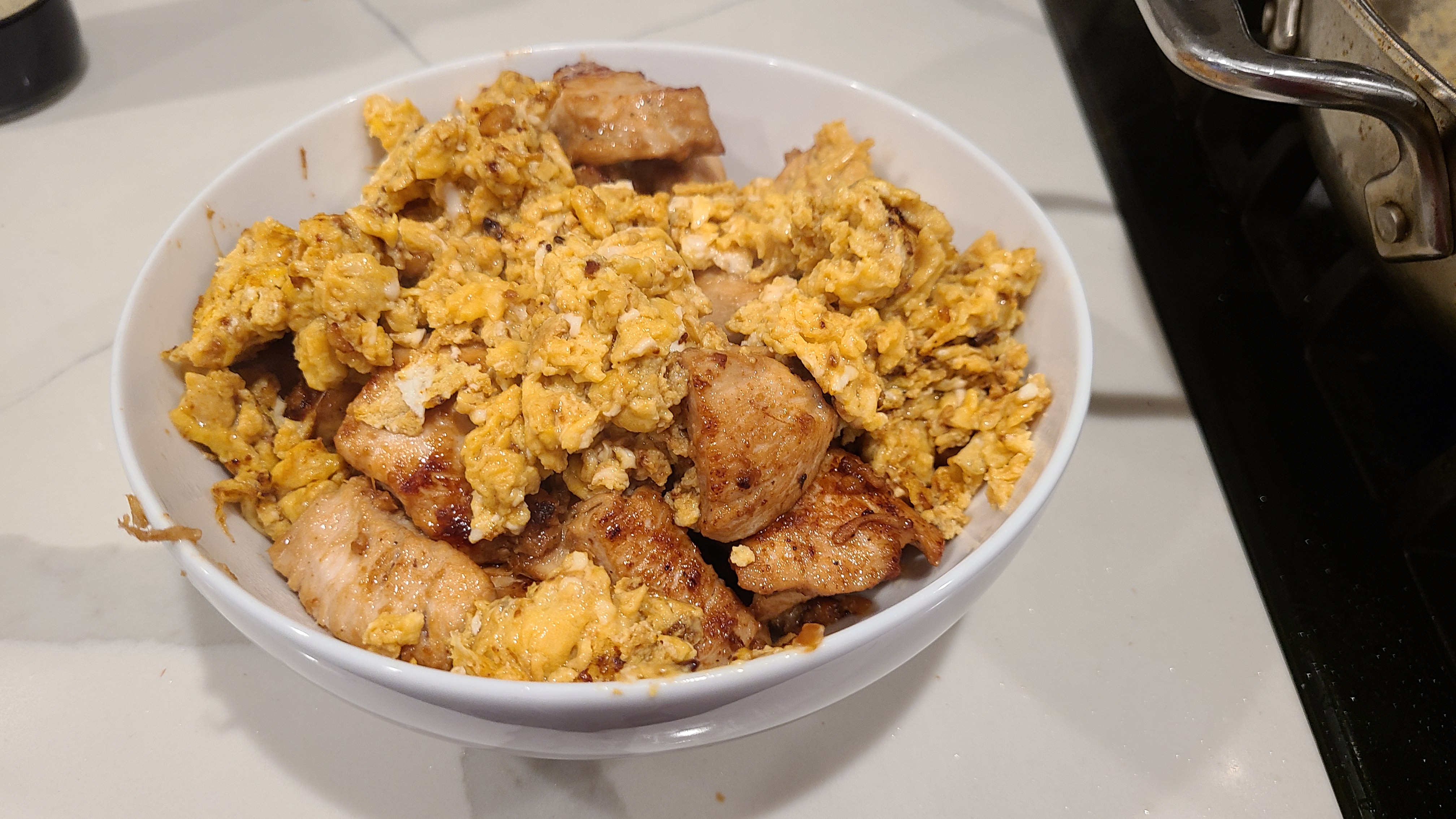 - Toss in the chicken and eggs that you set aside, and mix it up well. At this point you probably want to give it a try, and season it to your own taste. I ended up adding another splash of soy sauce, a dab of sesame oil, and a bit of pepper.