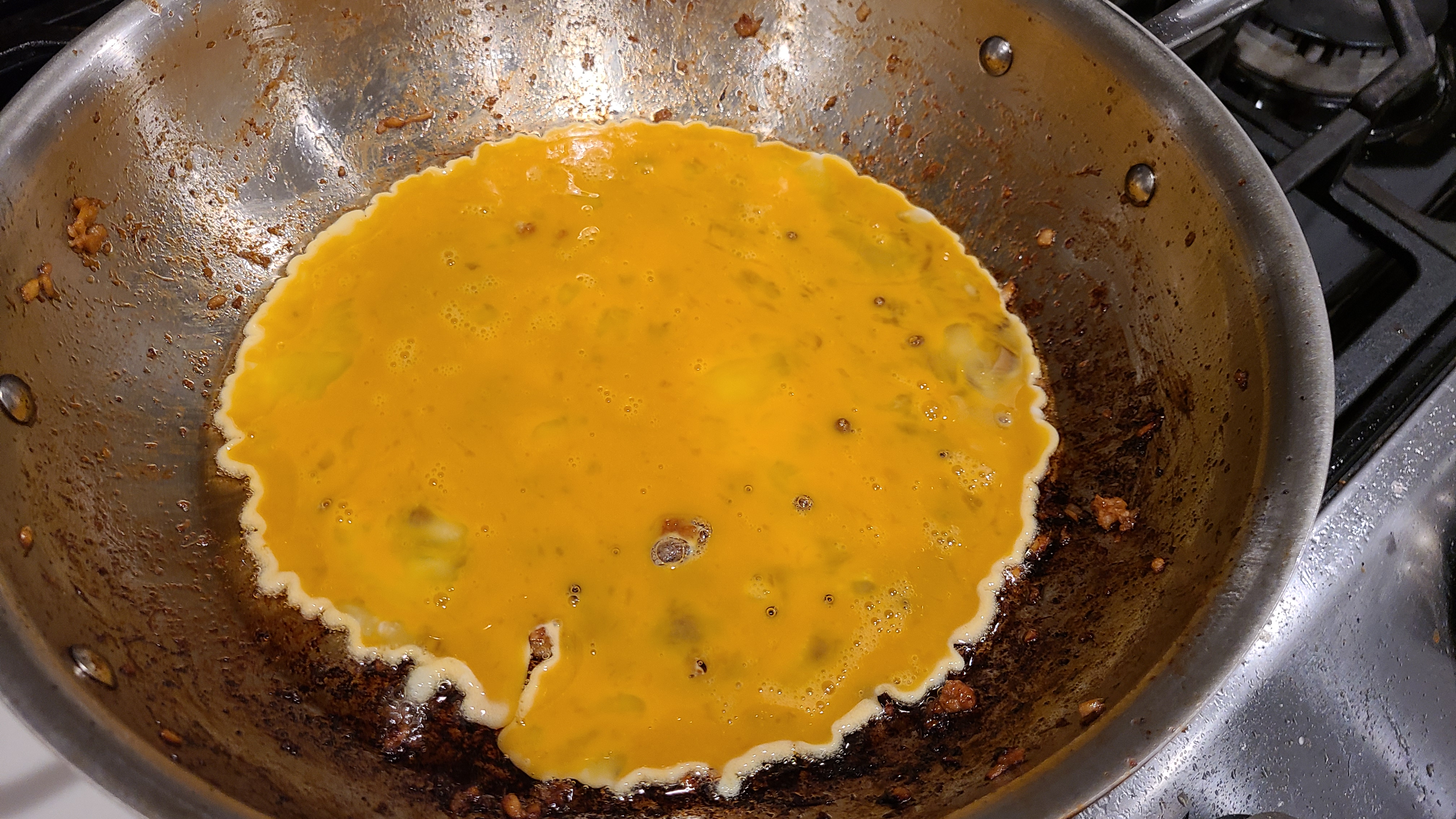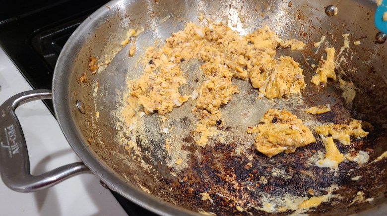 - Add the eggs into the pan, and give them a quick scramble, cooking the eggs into small to medium-sized curds. This should only take a minute or two, and when they’re done, remove them to the plate with the chicken.