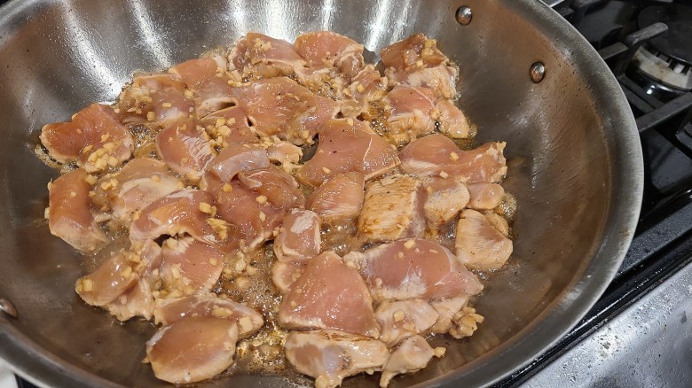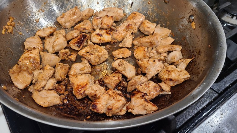 - Add the chicken to the pan (careful, it’ll be splattery) and stir-fry the chunks until they cook through and start to brown. This will probably take about 8 minutes. If you want to be more careful, use tongs and turn the pieces to make sure the chunks cook evenly.
