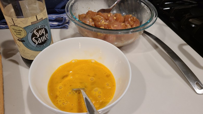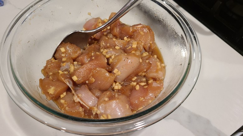 - Cube the chicken, and toss it with the garlic, ginger, soy sauce, sesame oil, honey, and a pinch of salt and pepper. Crack the eggs into bowl, and whip them with a splash (a teaspoon or less) of soy sauce.