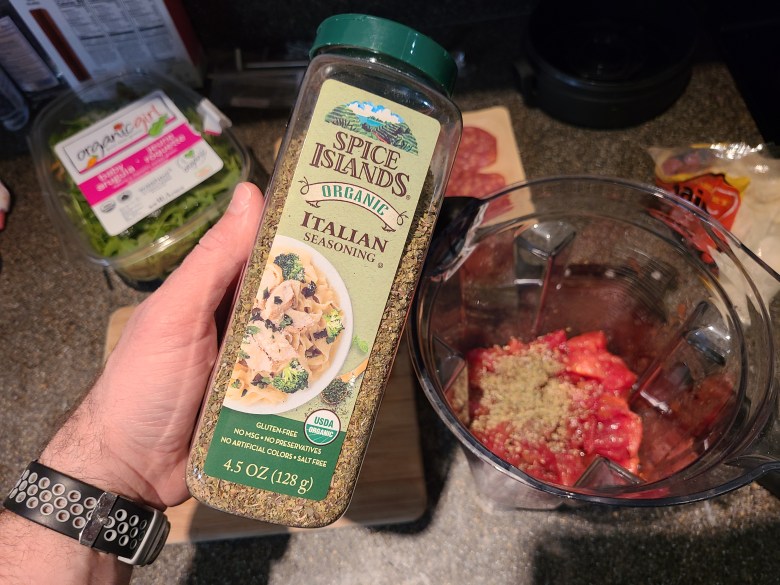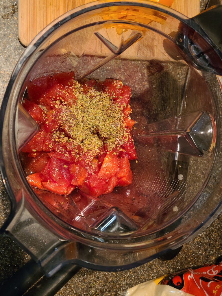 - Place the tomatoes, Italian seasoning, and pinches of salt and pepper, in a blender or food processor.
