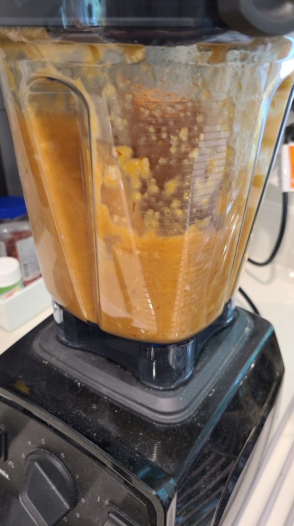 - Set the ribs aside, and place all of the prepared ingredients – the orange, pear, onion, ginger, garlic, soy sauce, sugar, vinegar, sambal oelek, mirin and sesame oil – into a blender, and turn it into a marinade. That’s right, liquify all of it. Give it some extra time to make sure you’re not left with any big floating chunks.
