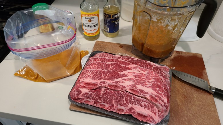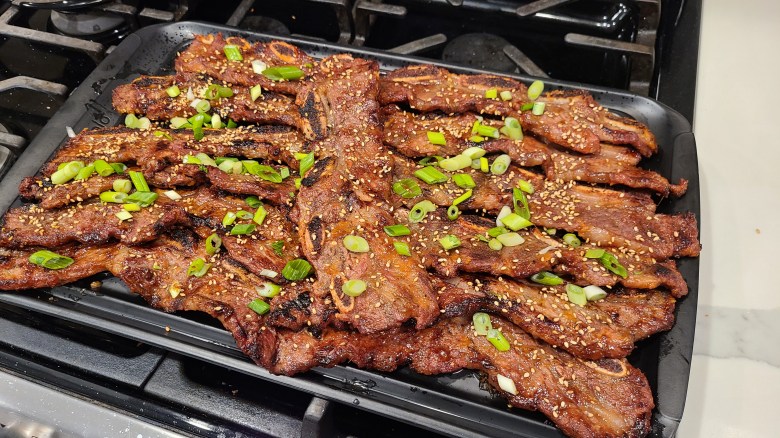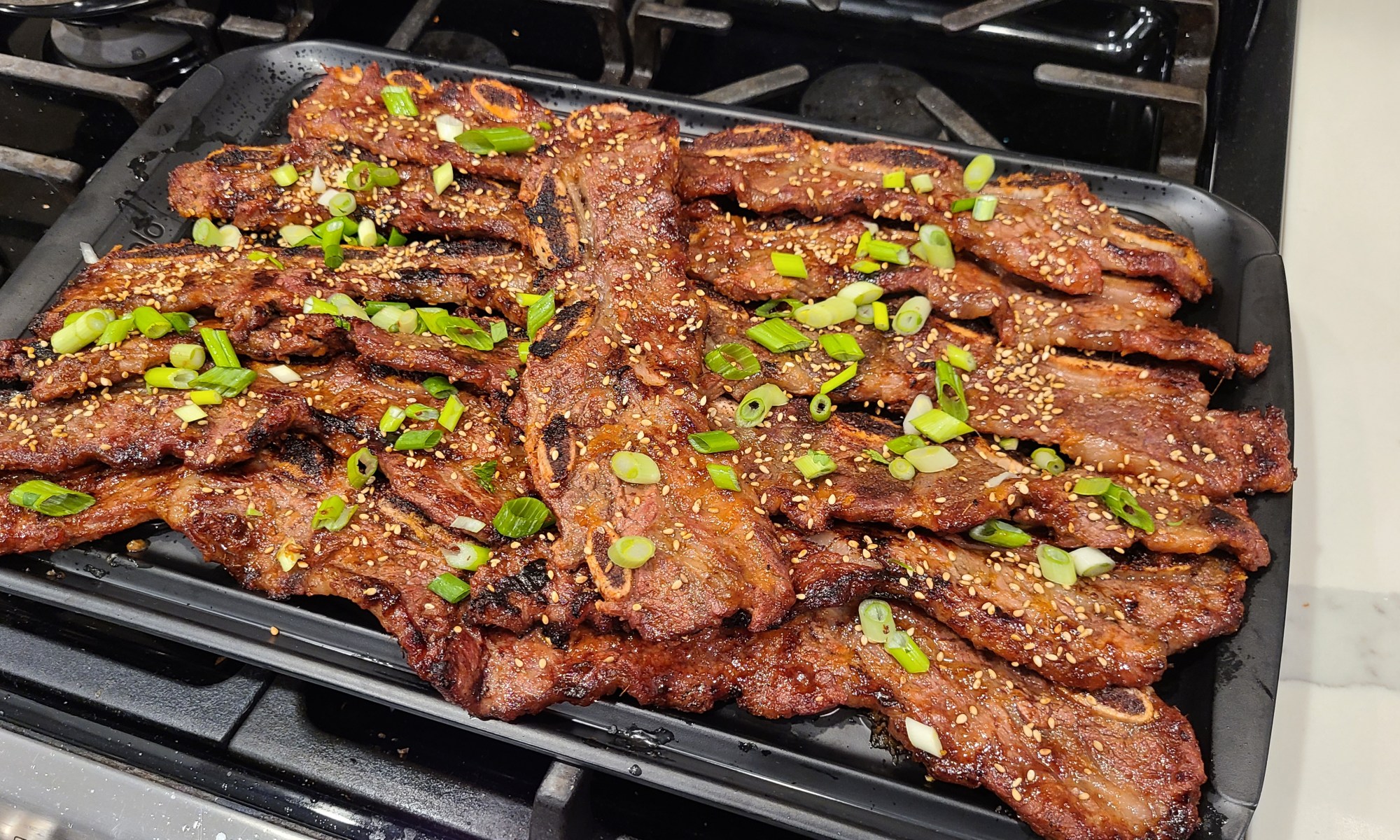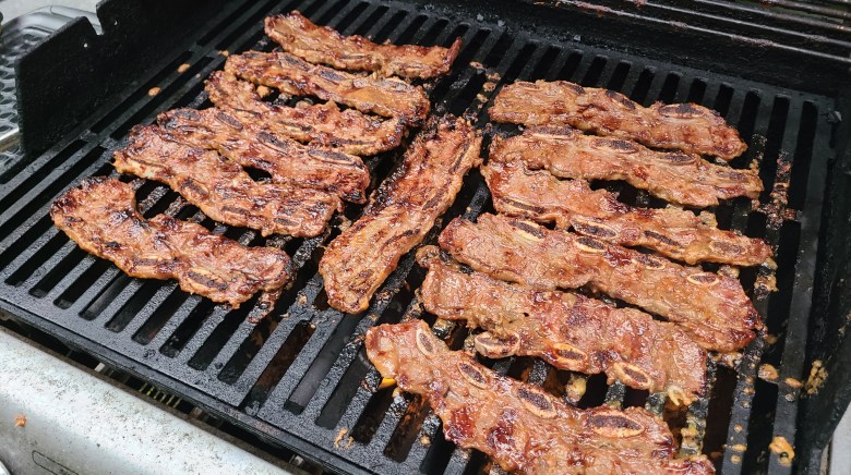 At some point, some genius of a butcher (I’m assuming) realized that if you slice the rib plate really thin (1/4 to 1/2 inch) against the bone, you can negate a whole bunch of those problems. The thin pieces of meat hold all of the rich beefy flavor of regular beef ribs, but you don’t have to spend hours breaking down the tissues to make it not rubbery. The thin cut allows for absorption of tasty marinades, and – BONUS – cooks to tender perfection surprisingly quickly.