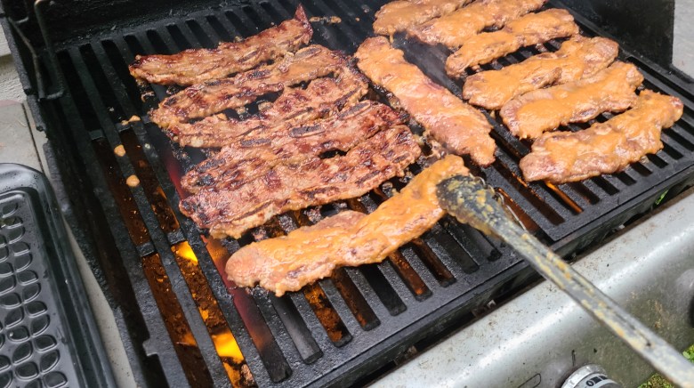 - When the grill is hot, give it a quick blast of cooking spray, and lay the strips of steak out flat on the grill. Depending on the amount of steak, you may need to work in batches.