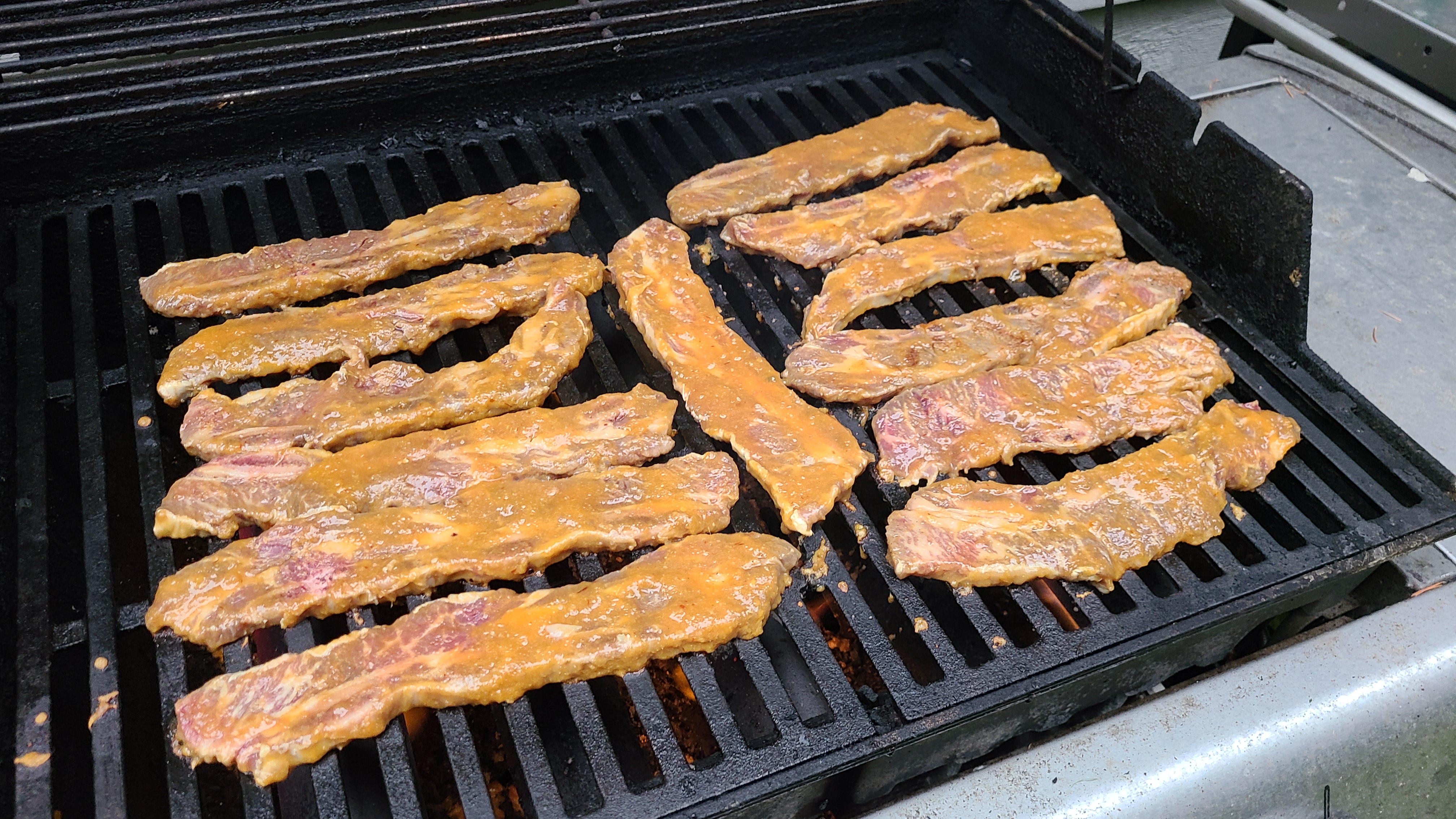 - When the grill is hot, give it a quick blast of cooking spray, and lay the strips of steak out flat on the grill. Depending on the amount of steak, you may need to work in batches.