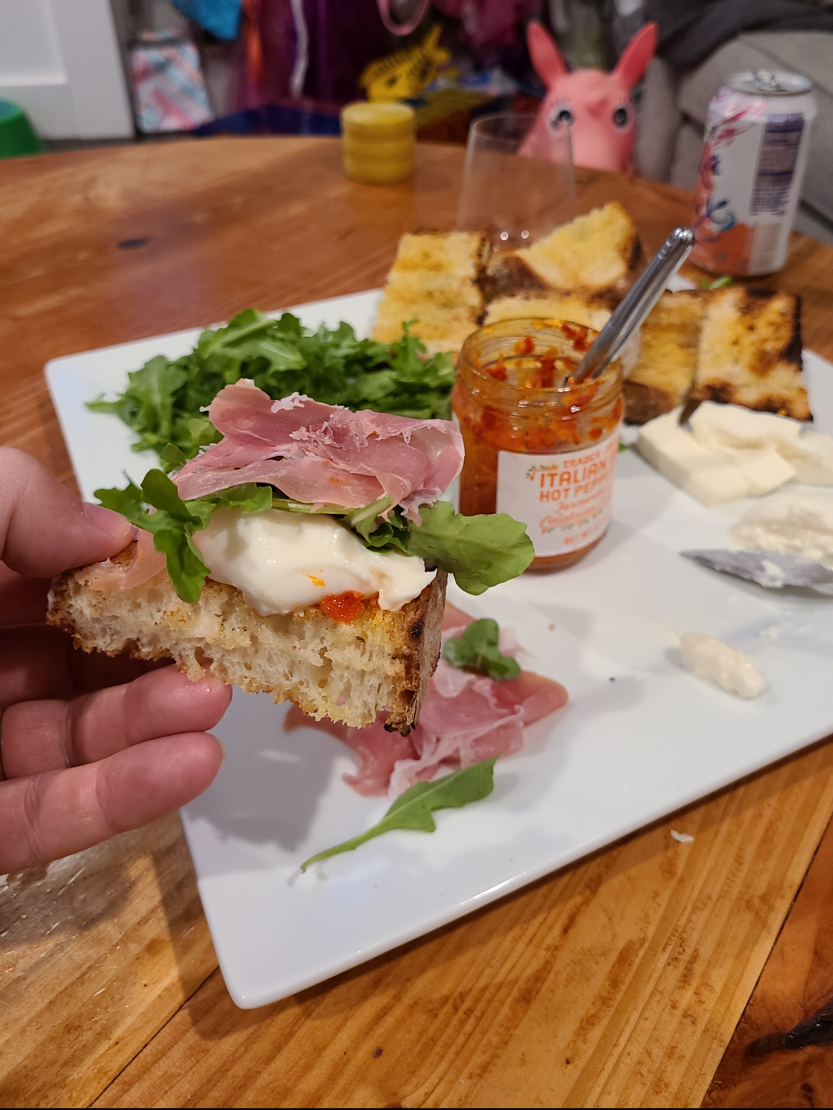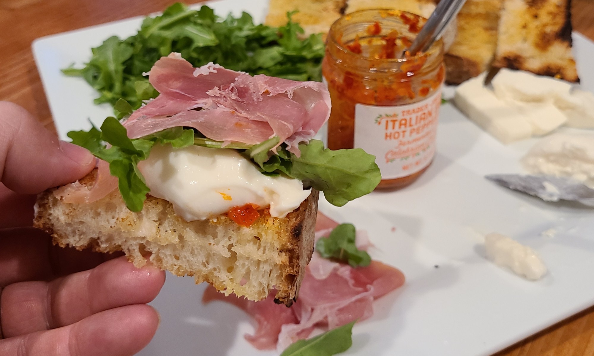 - Assemble your bites with a hunk of bread, some pepper spread (or your dressing of choice), a bit of burrata, a few leaves of arugula, and a slice of cured meat.