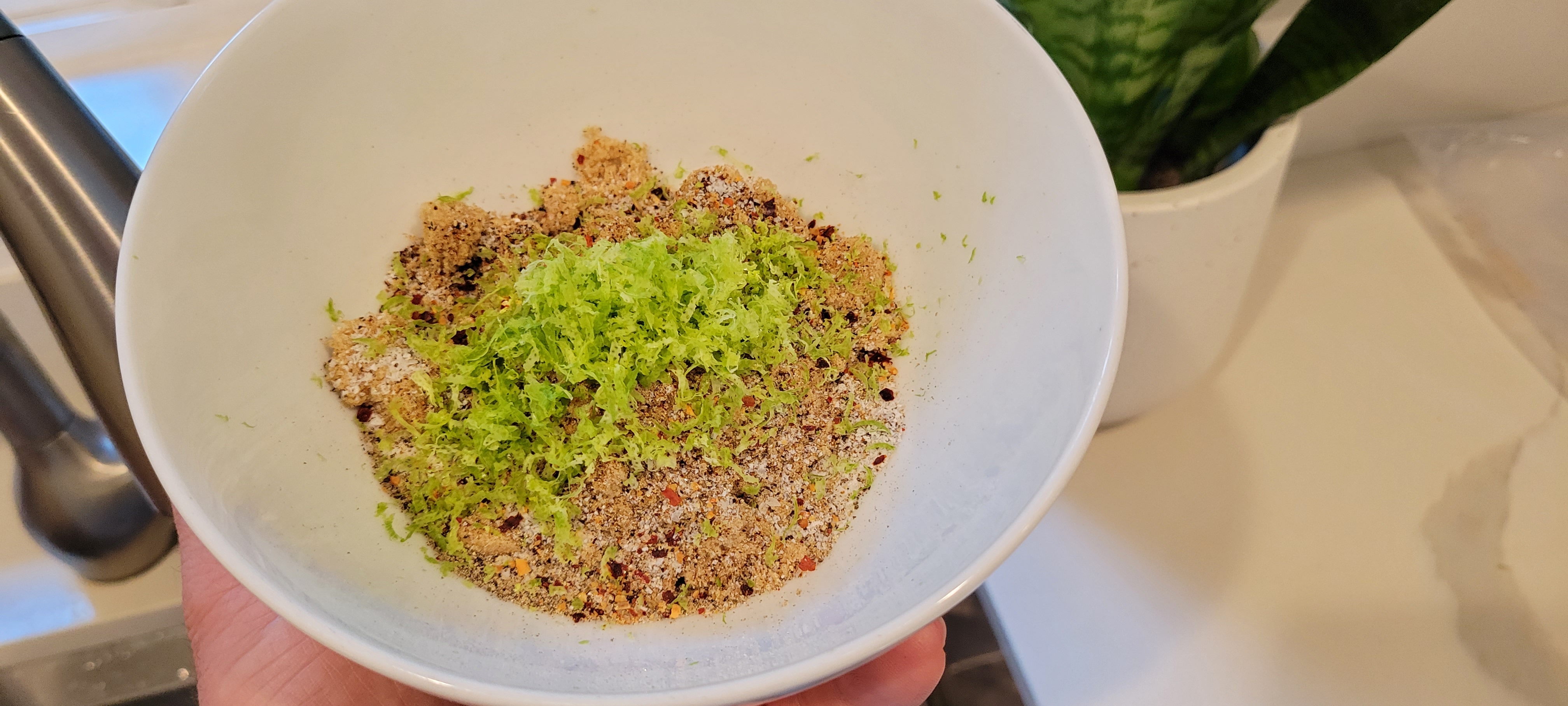 - As the grill/charcoal is heating, prepare the rub by combining the sugar, salt, pepper, chili powder, cumin and lime zest.
