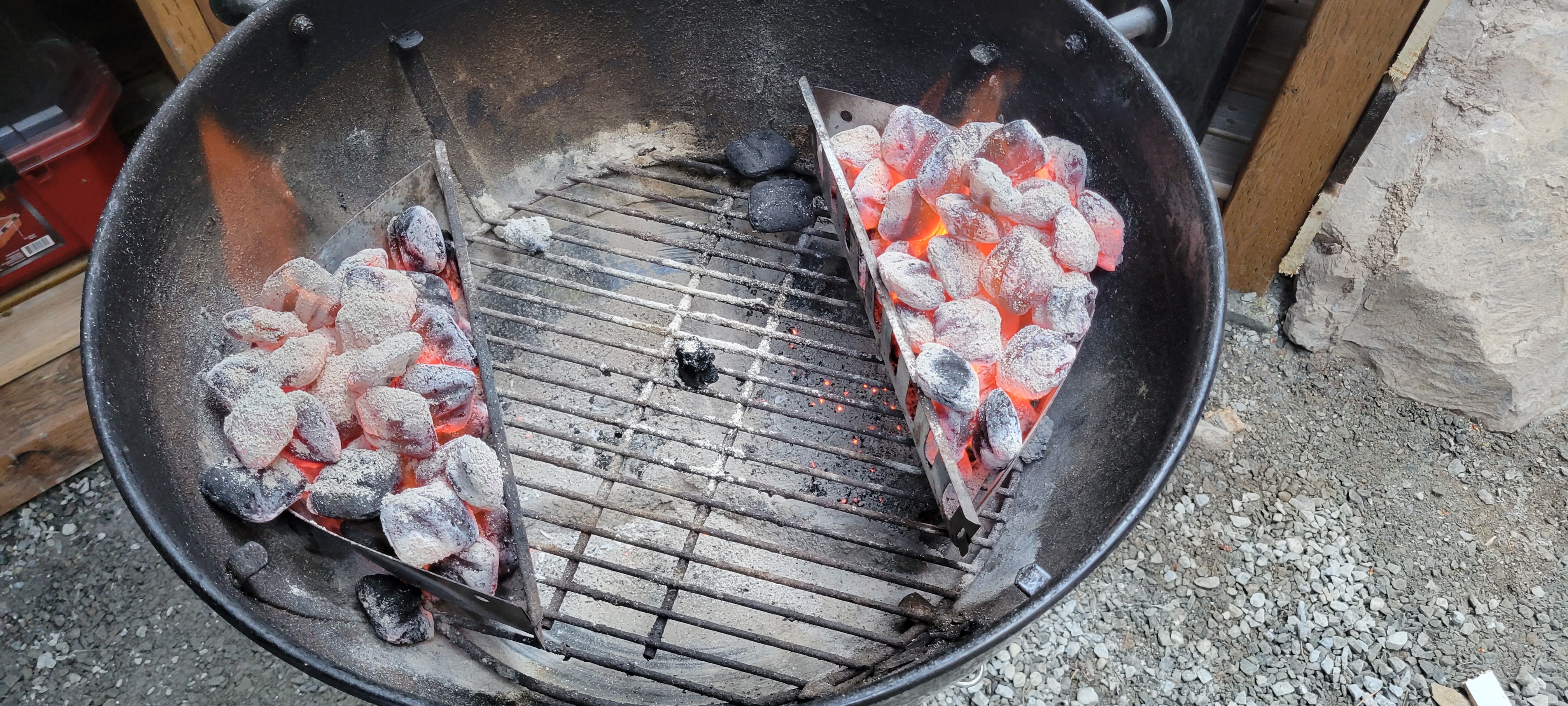 - Preheat your grill/light your charcoal, and set your grill up for indirect cooking. On a (three-burner) gas grill, this means lighting your outer burners, and leaving the middle one off. For my purposes, I divided my preheated charcoal between two grill baskets on either side of my grill (pictures below)