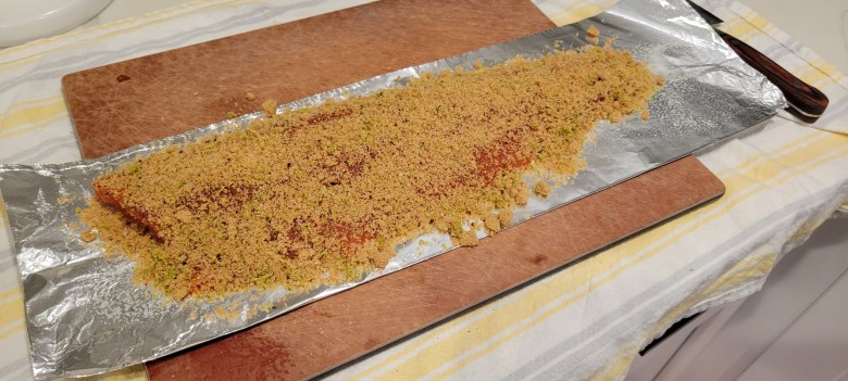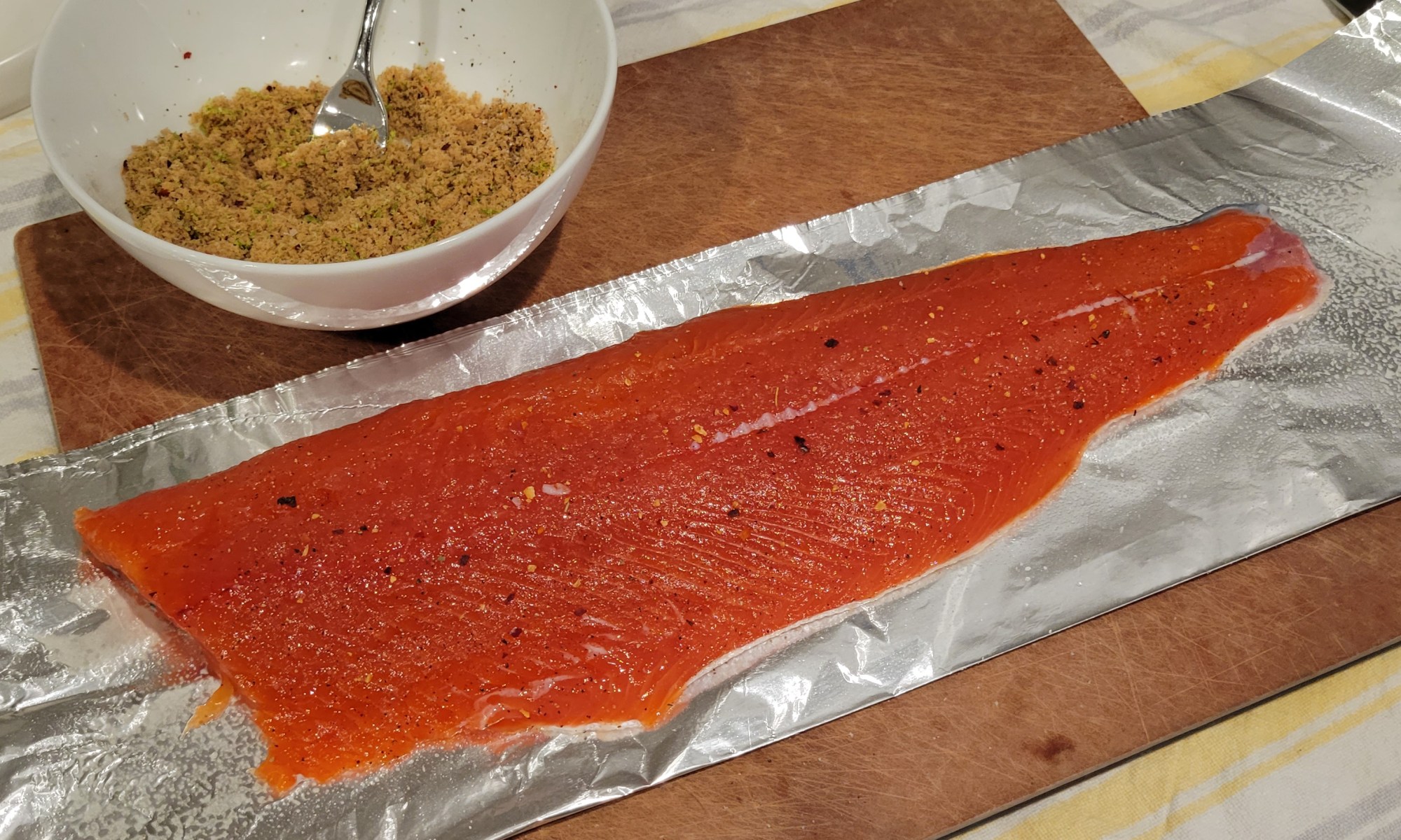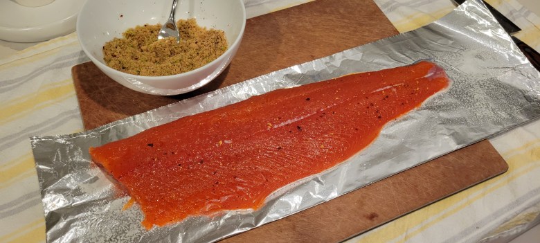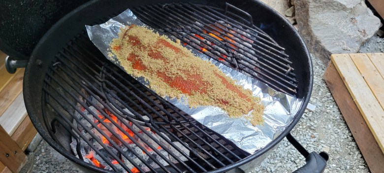 - Place the salmon fillet on top of a piece of aluminum foil, and spread the brown sugar and spice mixture over the entire fillet. Note – if you want crispy skin, you’ll need to modify my method a bit. In this case, I left the fillet on the foil for the entire cook, which makes it easy to transfer on and off the grill, and keeps all the sugar glaze from dripping into the grill.
