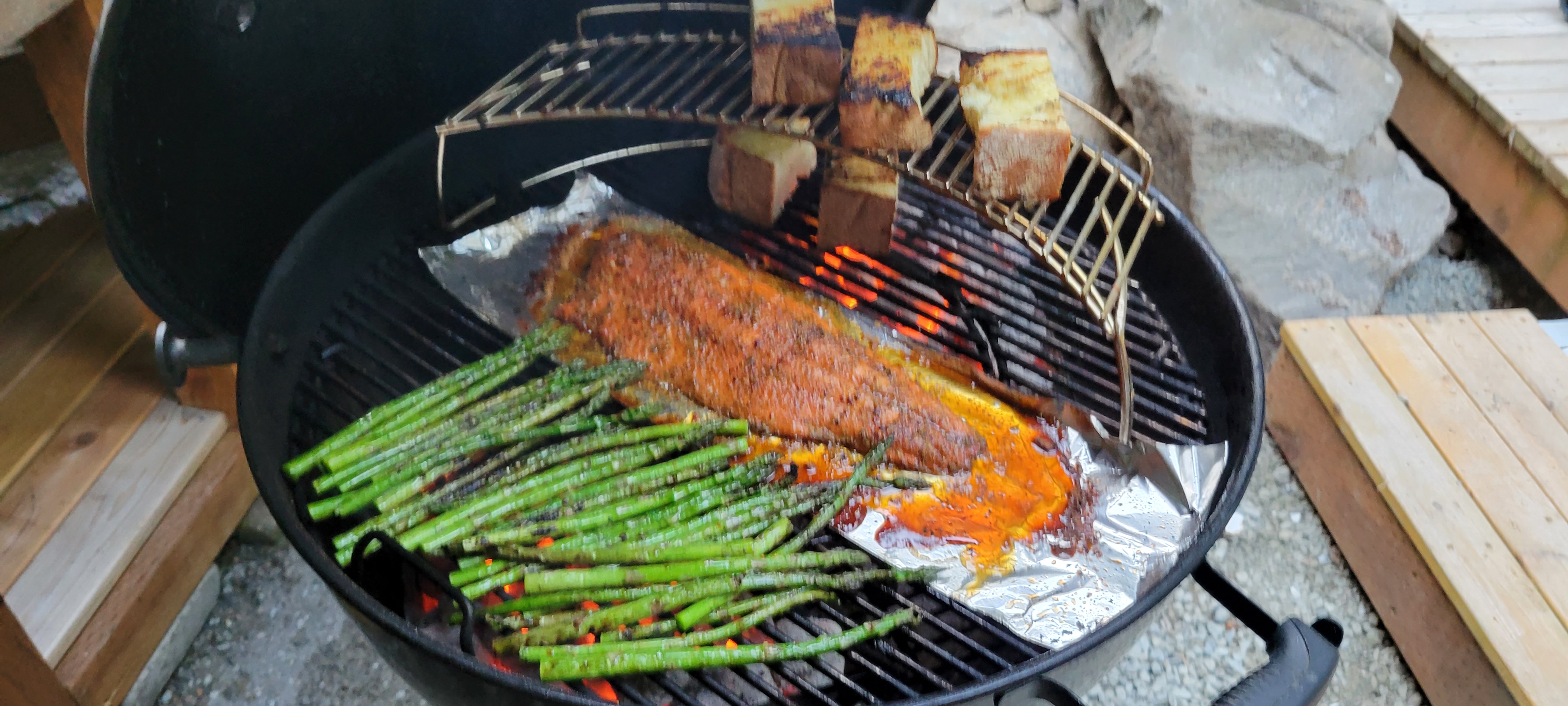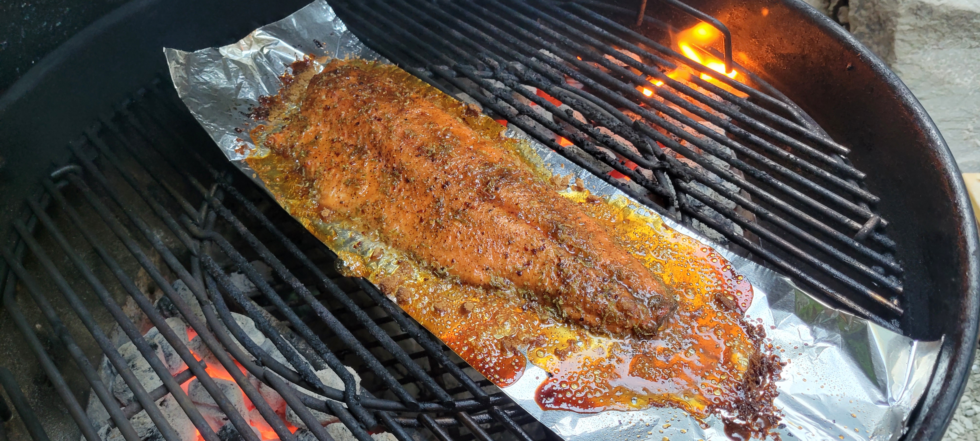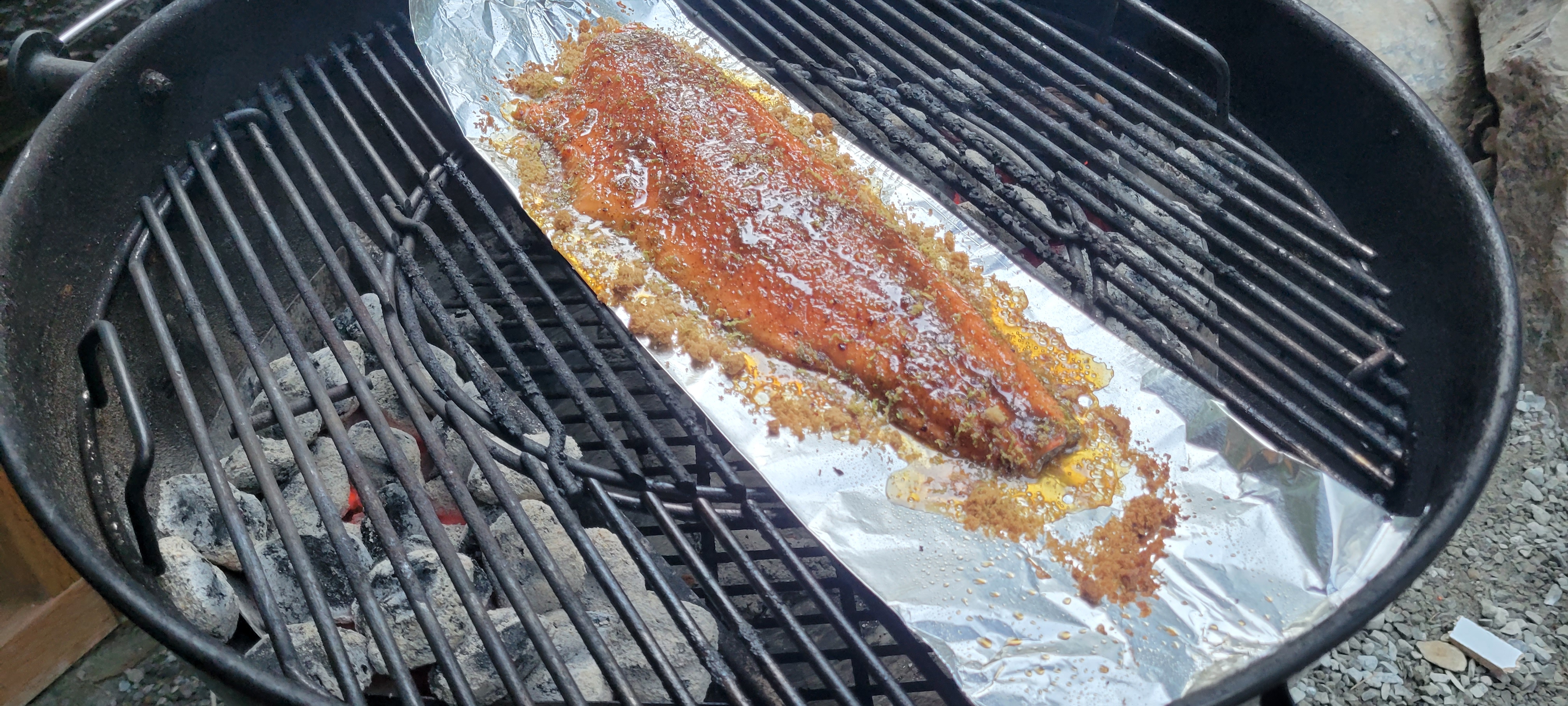 In this case, I prepared a whole fillet of Coho salmon with a brown sugar based chili lime rub, which turned into a glaze as the fish cooked. Then I cooked the salmon on my Weber kettle using charcoal in an indirect heat grilling method, which took a little longer than usual, but yielded very moist and flavorful fish.