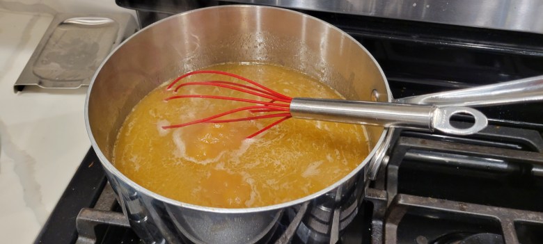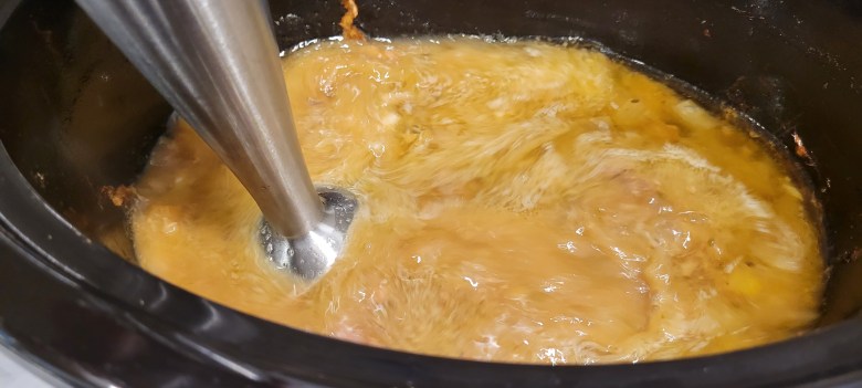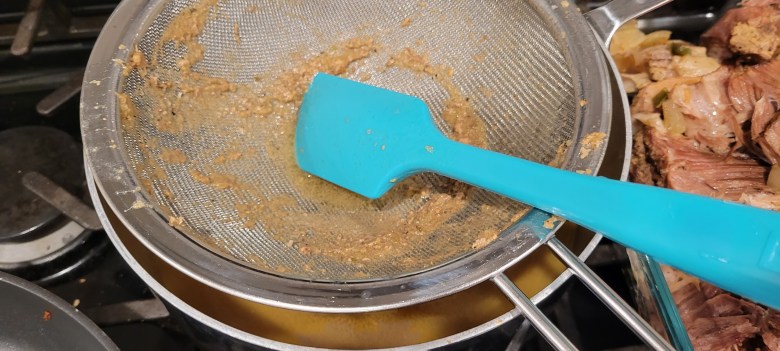 - As the pork is cooling, I recommend straining the remaining liquid, or using an immersion blender to liquify the floaty bits. Either way is effective, as long as you have a mixture of fatty drippings that you can use later on.