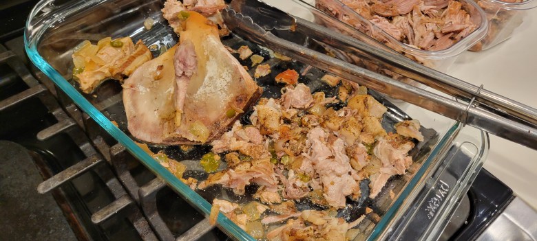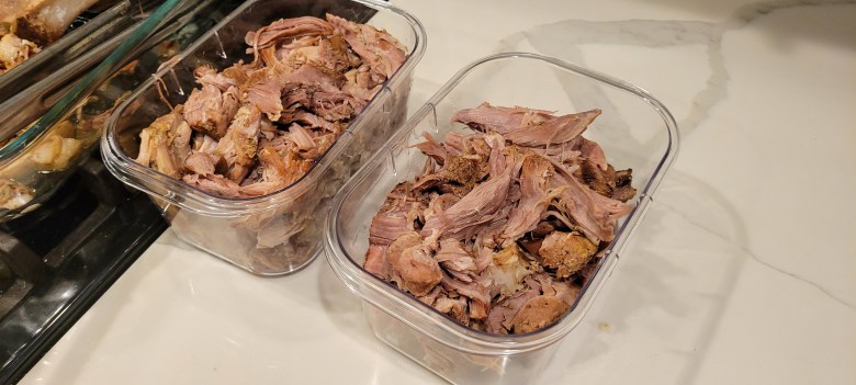 - Pull the pork apart, and figure out what you’re going to serve immediately, and what you’ll be saving for later. The stuff that you’ll be saving for later should be given a healthy pour of the drippings to make sure it stays moist, and comes back juicy (yes, even from the freezer).